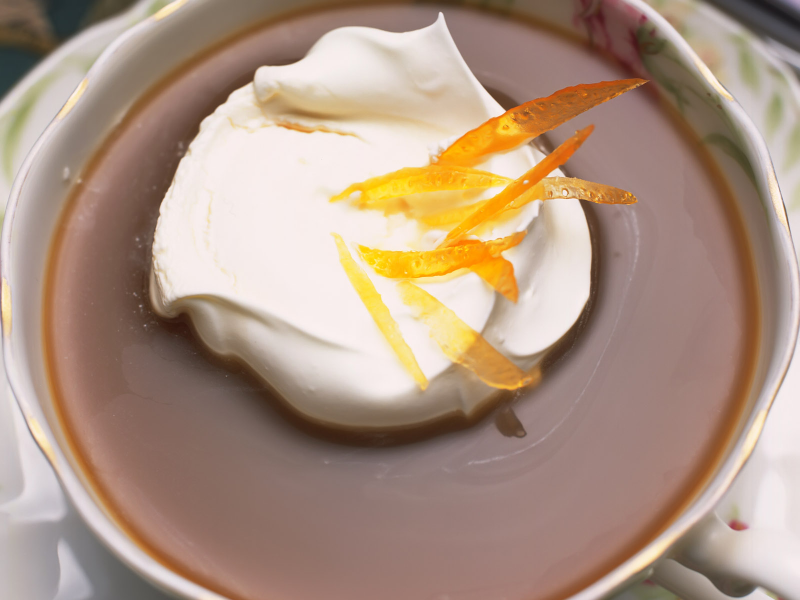 Чашка ароматного чая с веткой ели на деревянном фоне