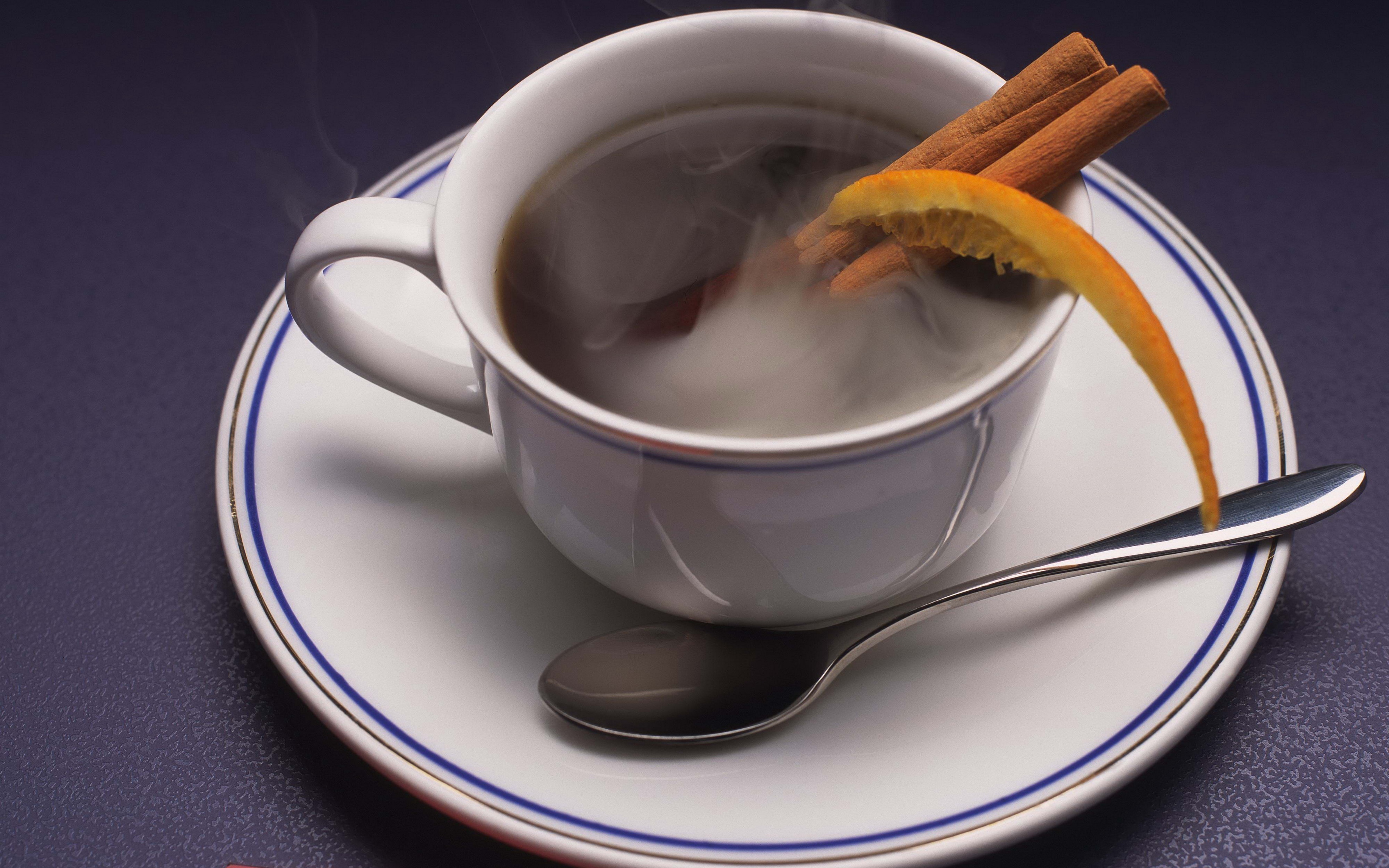 Чашка ароматного чая с веткой ели на деревянном фоне