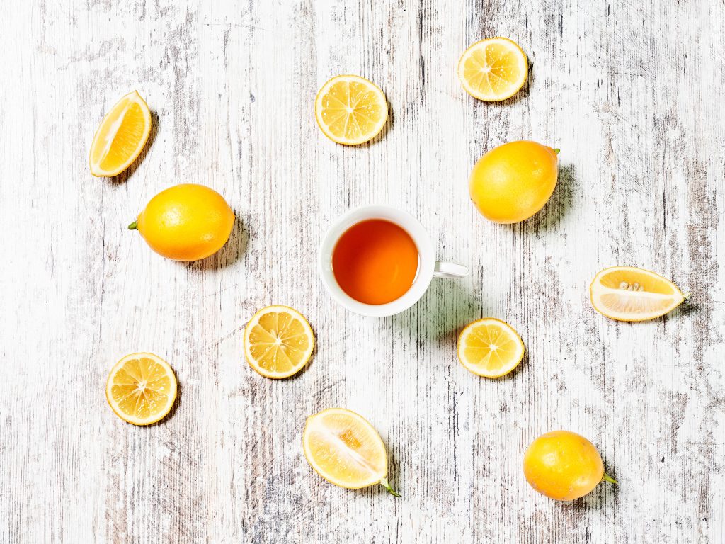 Желтые лимоны с чаем на белом столе - 5120x3413
