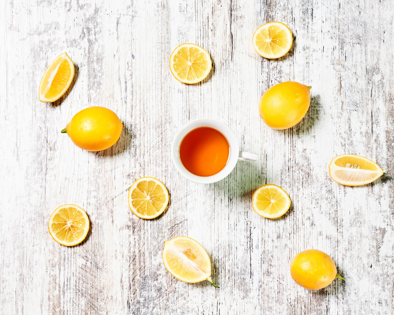 Желтые лимоны с чаем на белом столе - 5120x3413