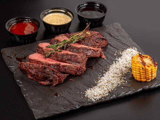 Кусок запеченного мяса на доске с кукурузой и специями - 4050x2700