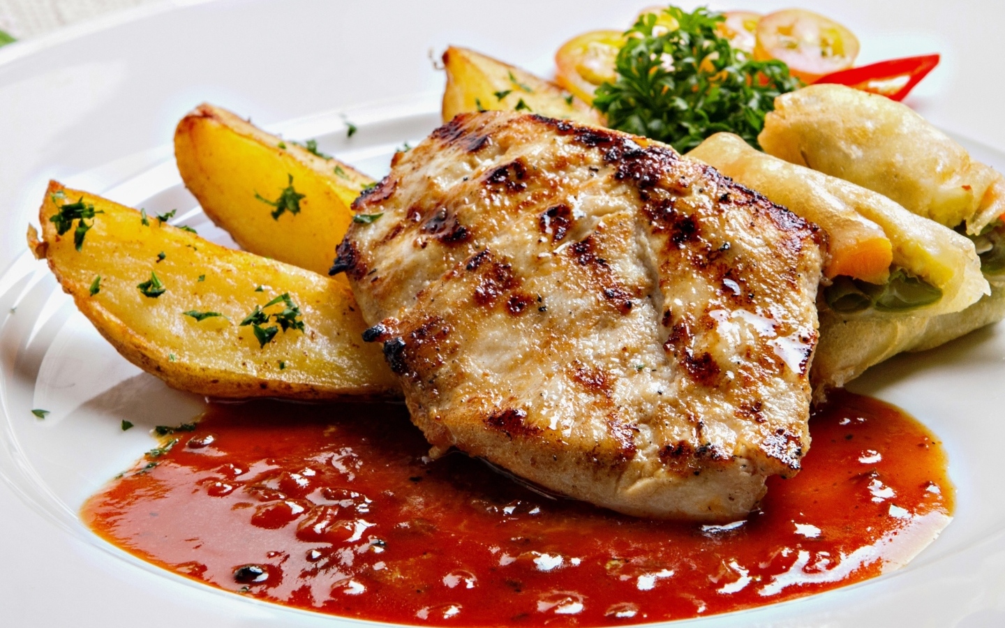 Кусок мяса гриль на тарелке с картофелем Обои для рабочего стола 1440x900