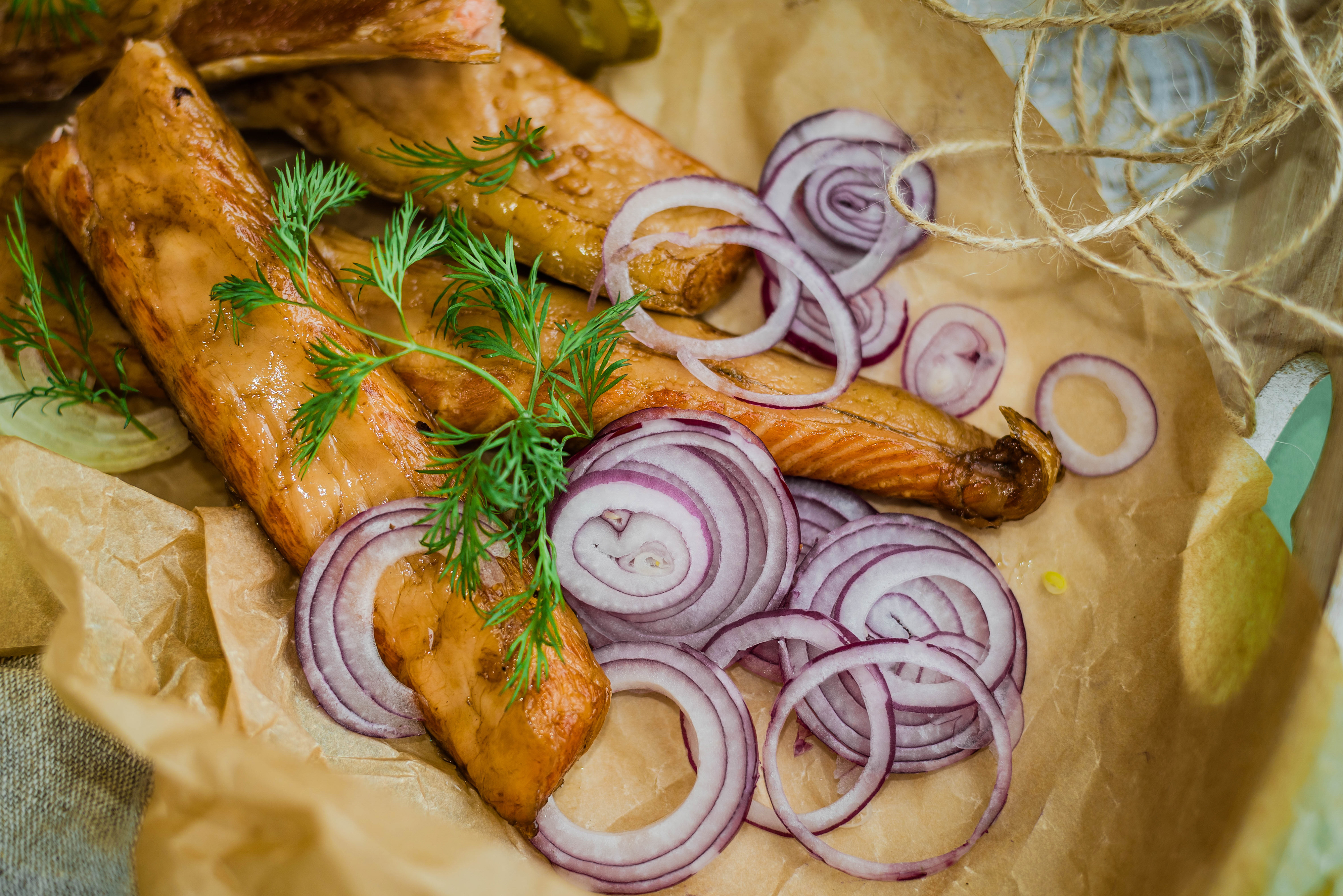 Обои: Копченое филе рыбы на бумаге с луком
