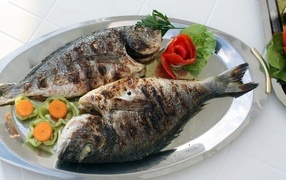 Запеченная рыба на тарелке с овощами