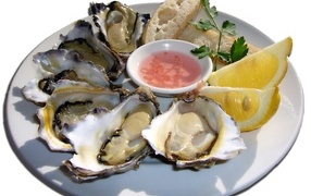 Устрицы на белой тарелке с лимоном
