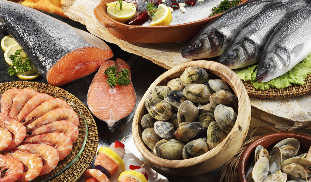 Мидии, креветки и свежая рыба на столе Обои для рабочего стола 1024x600