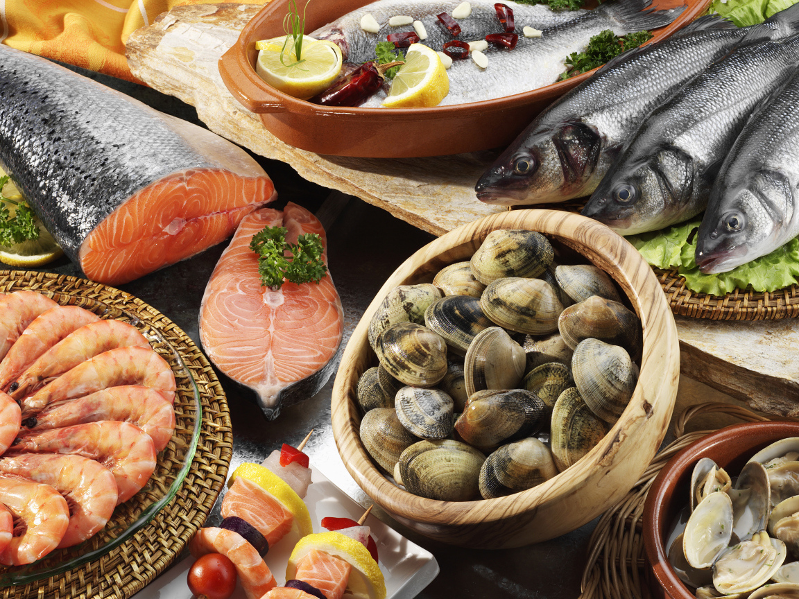 Мидии, креветки и свежая рыба на столе - 3072x2019