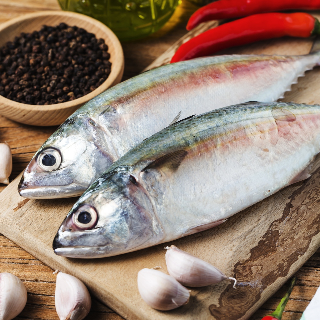 Свежая рыба лежит на доске с чесноком и специями - 5472x3648