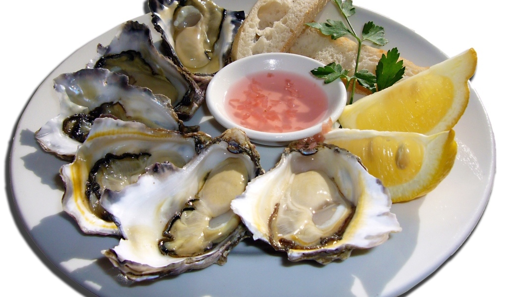 Устрицы на белой тарелке с лимоном - 2598x2008