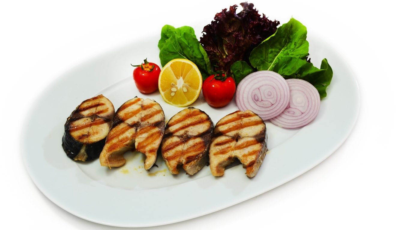 Рыба жаренная на гриле на тарелке с овощами Обои для рабочего стола 1366x768