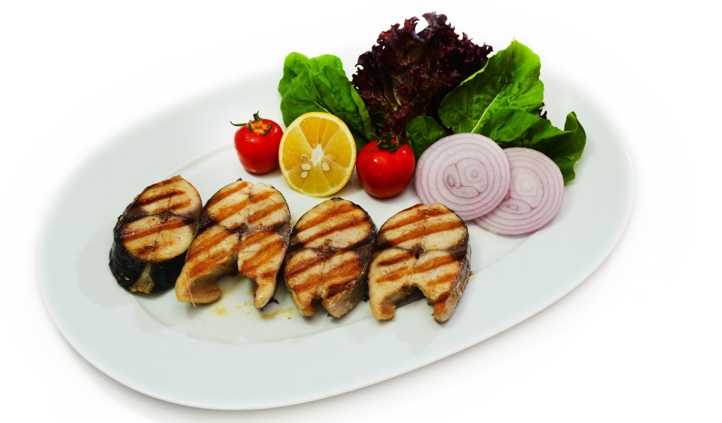 Рыба жаренная на гриле на тарелке с овощами - 6000x4000