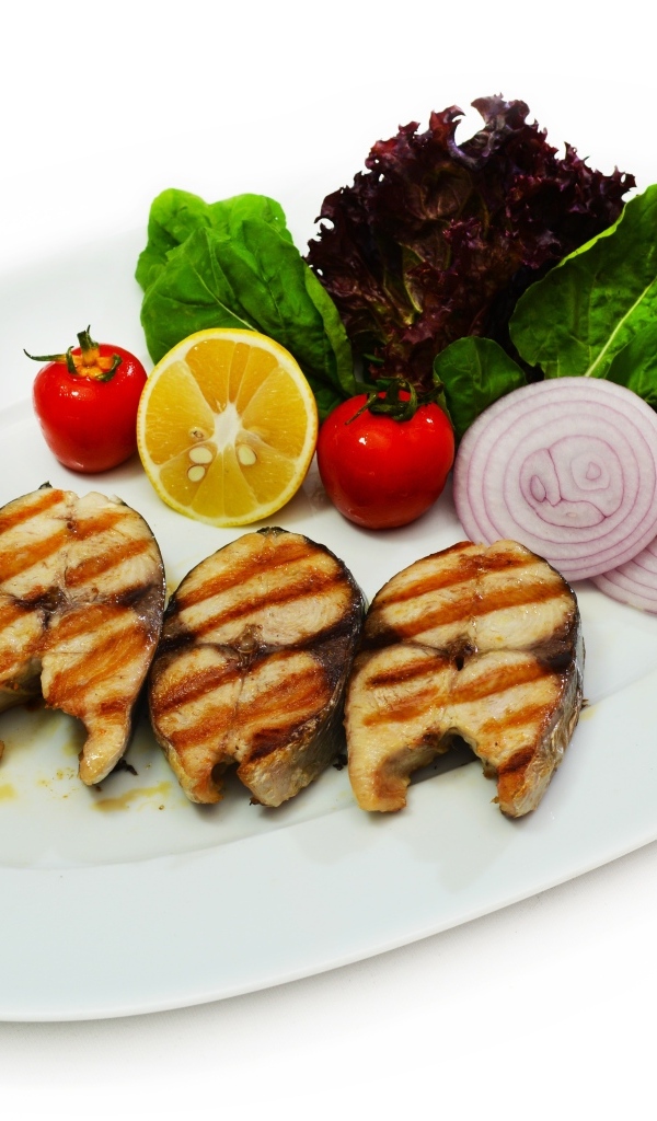 Рыба жаренная на гриле на тарелке с овощами Обои для рабочего стола 600x1024
