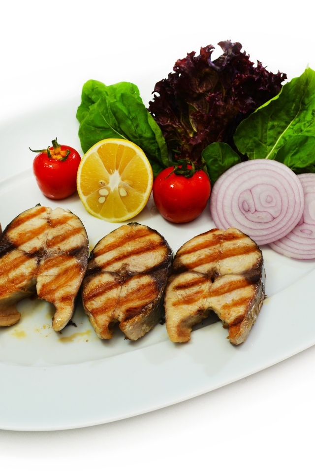 Рыба жаренная на гриле на тарелке с овощами Обои для рабочего стола 640x960