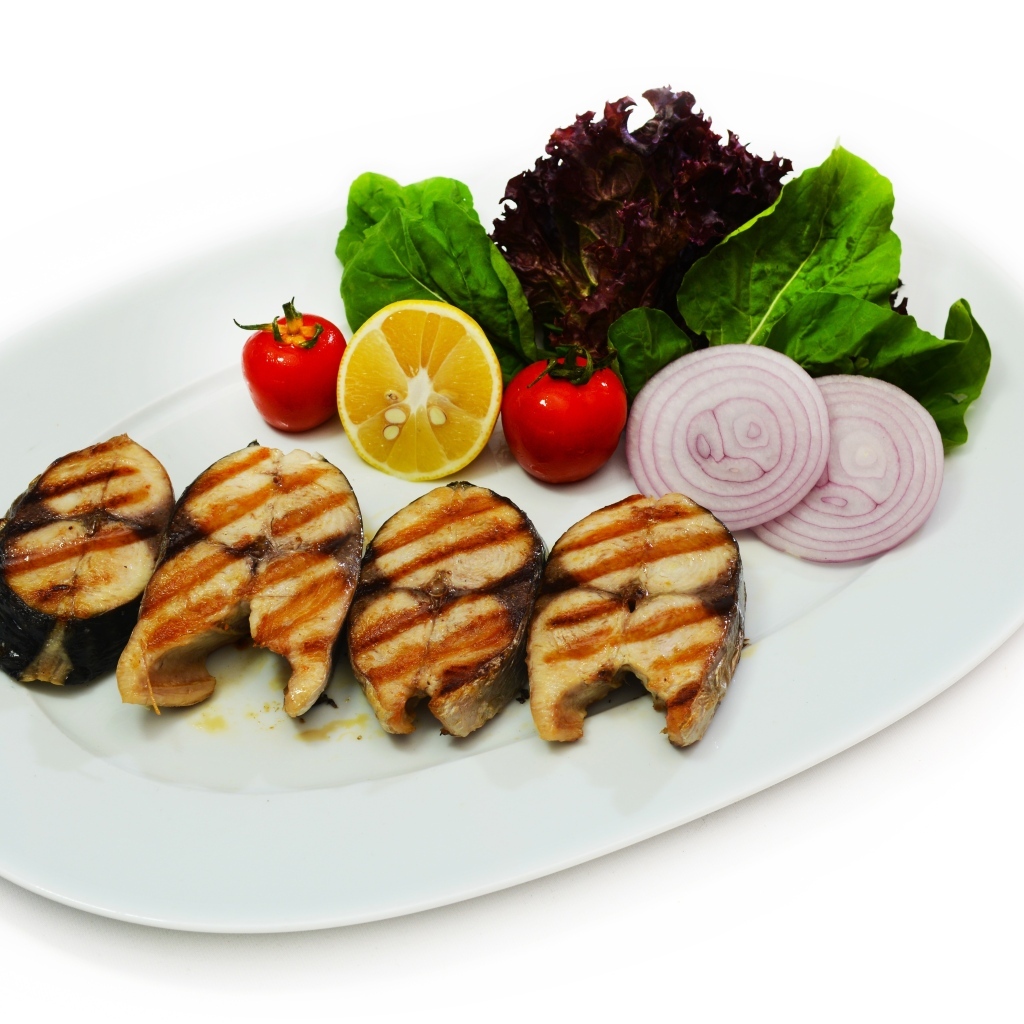 Рыба жаренная на гриле на тарелке с овощами Обои для рабочего стола 1024x1024