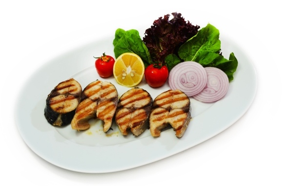 Рыба жаренная на гриле на тарелке с овощами Обои для рабочего стола 600x382