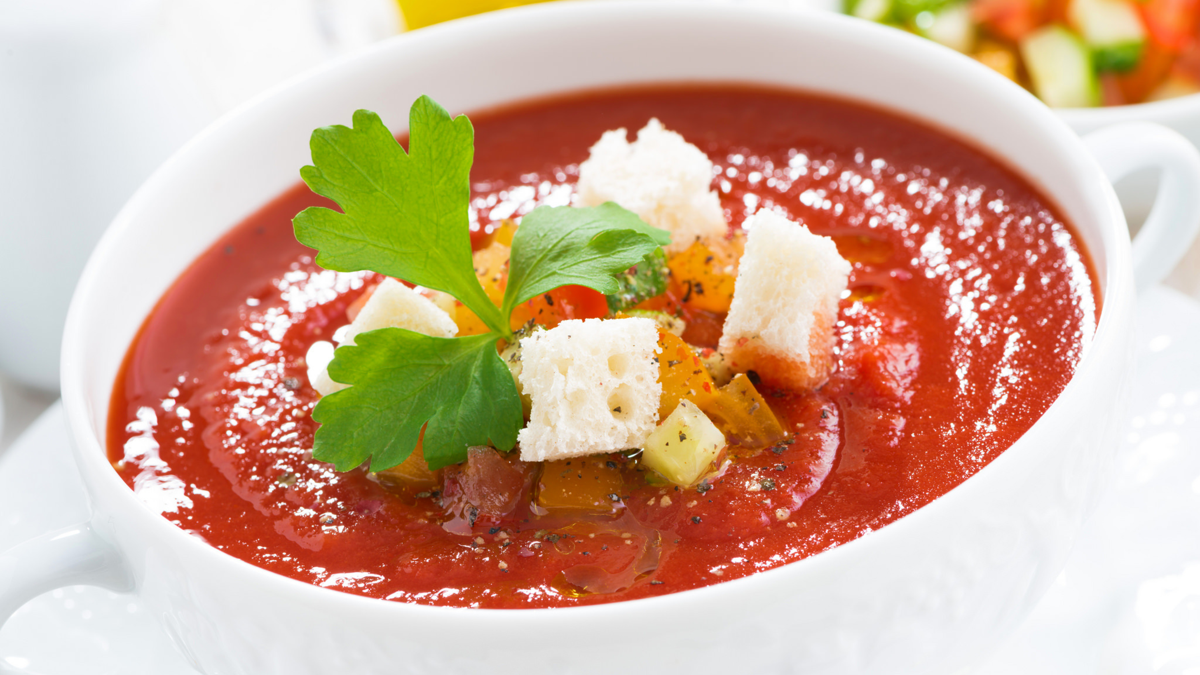 Томатный суп в белой тарелке с гренками - 3840x2160