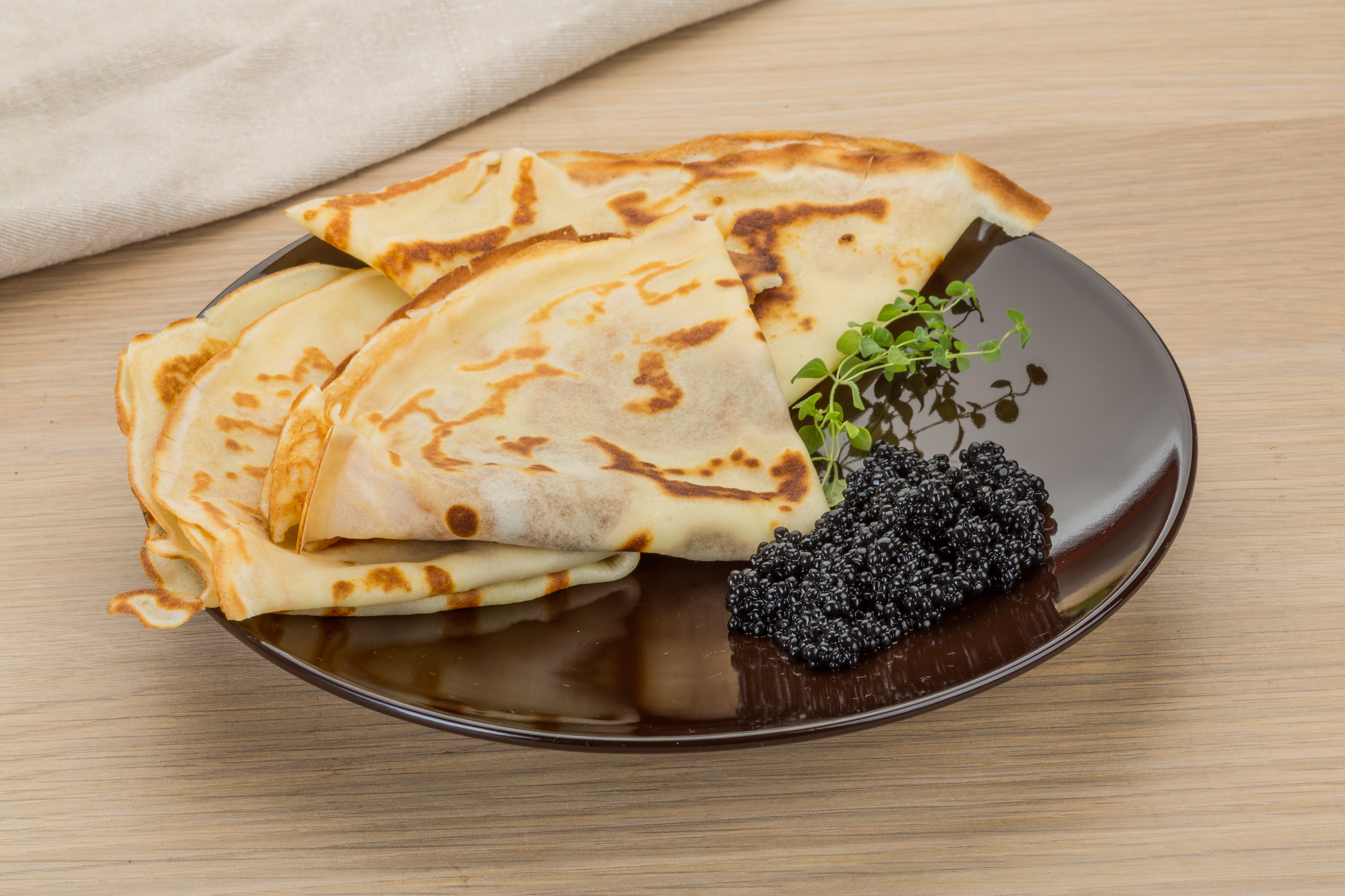 Тонкие блины на тарелке с черной икрой