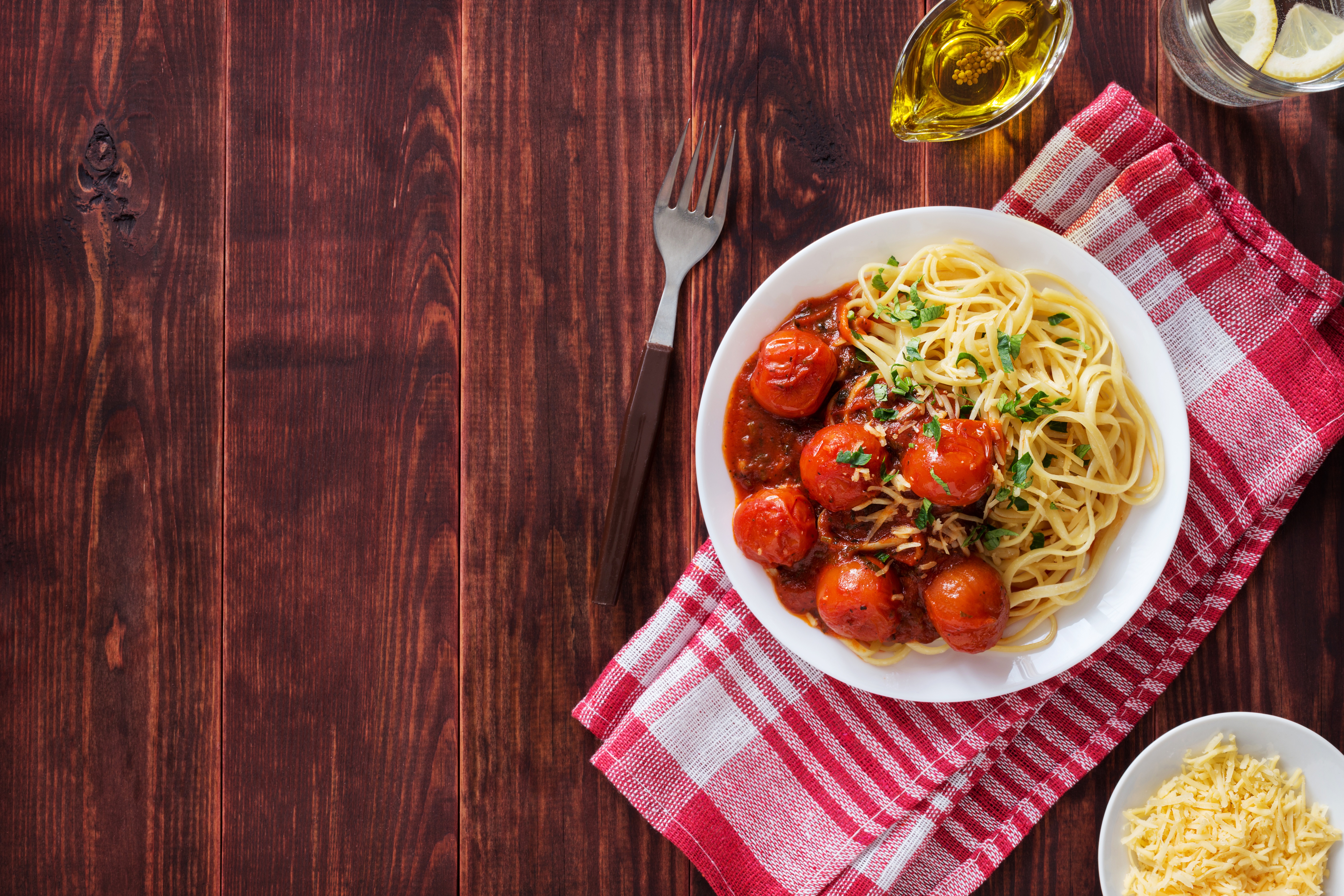 Спагетти с помидорами и сыром на столе - 5463x3642