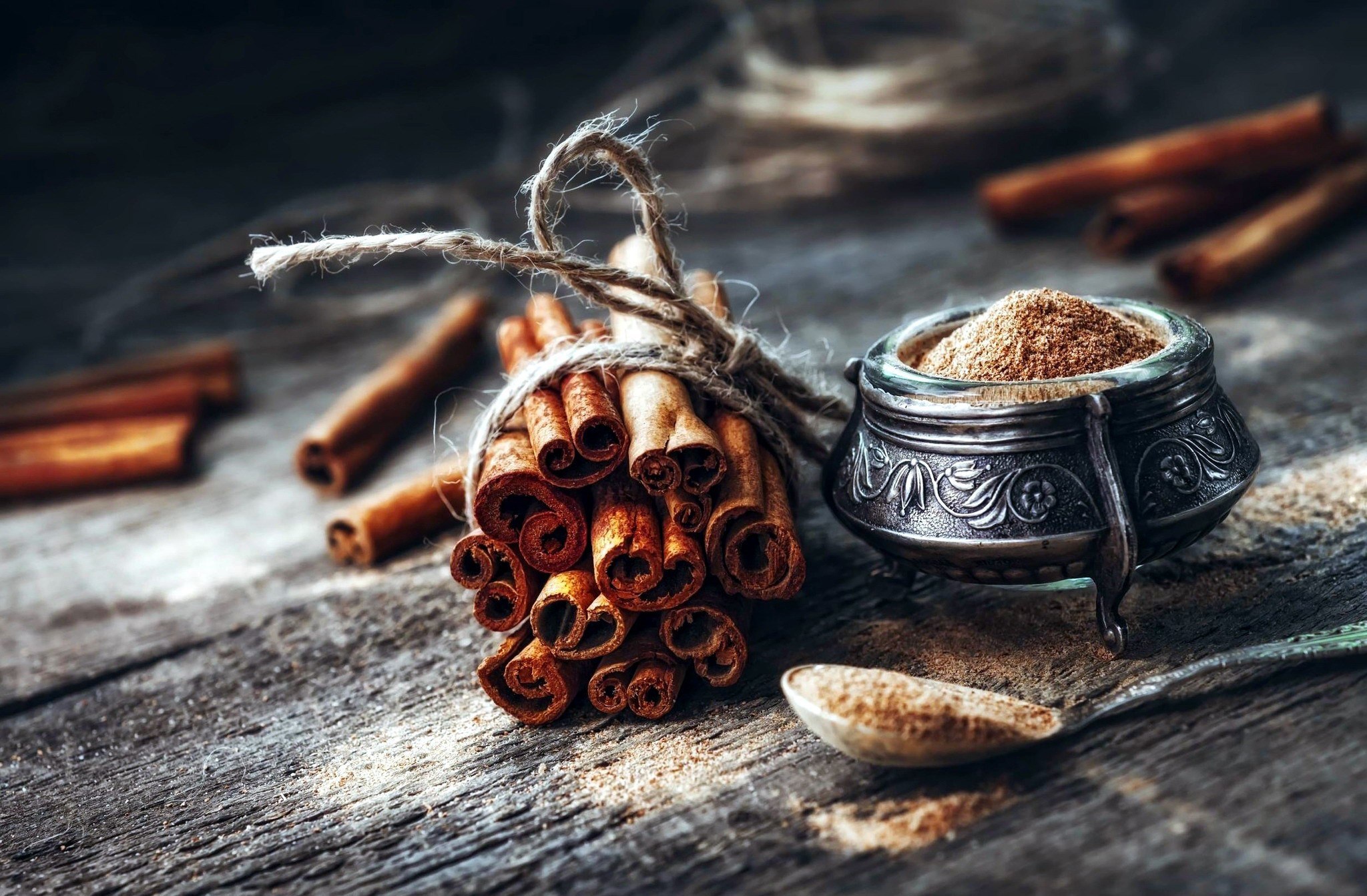 Палочки корицы на столе с молотой корицей - 2048x1342