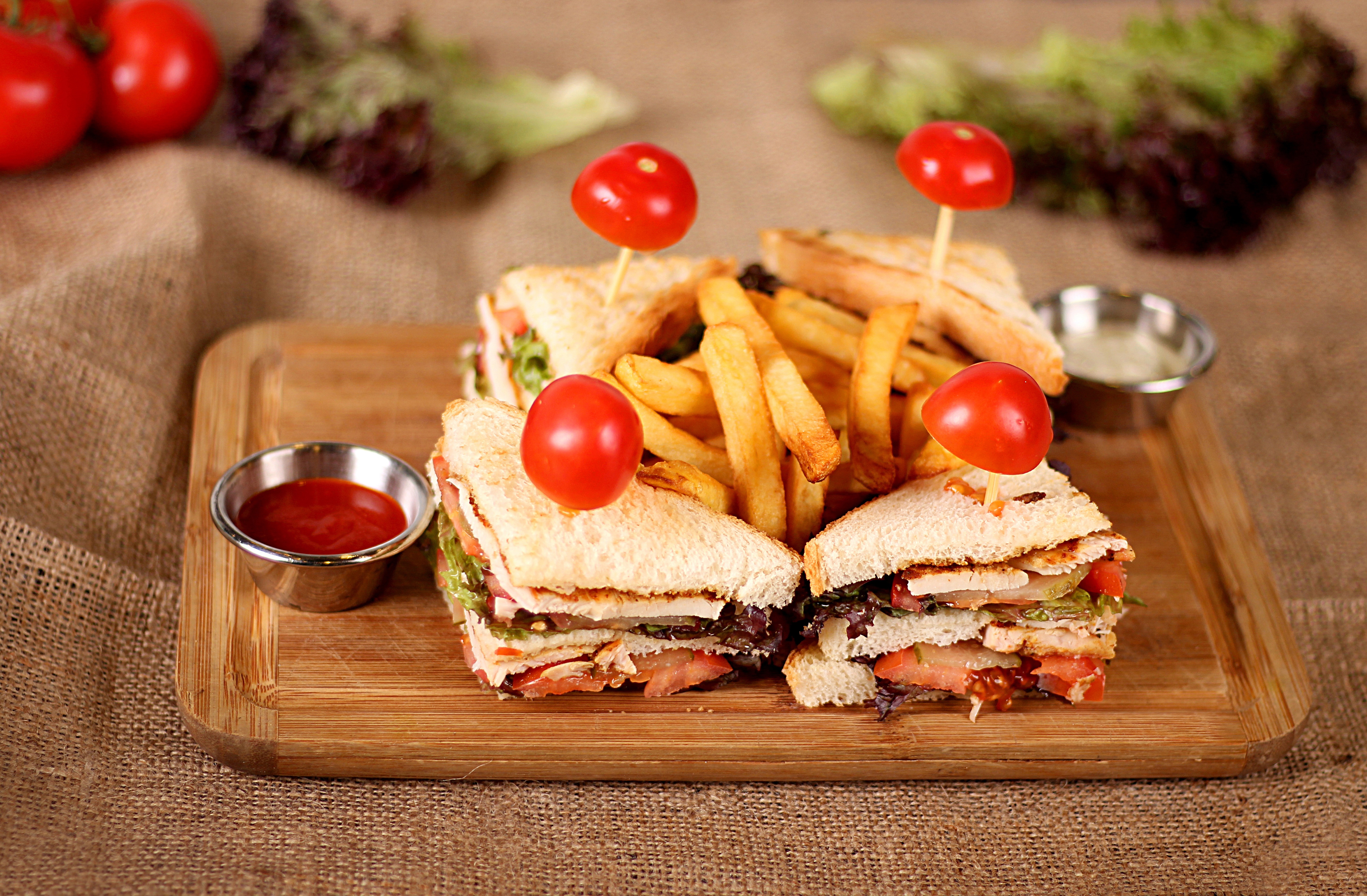 Сэндвичи на доске с картофелем фри и соусом - 5339x3500