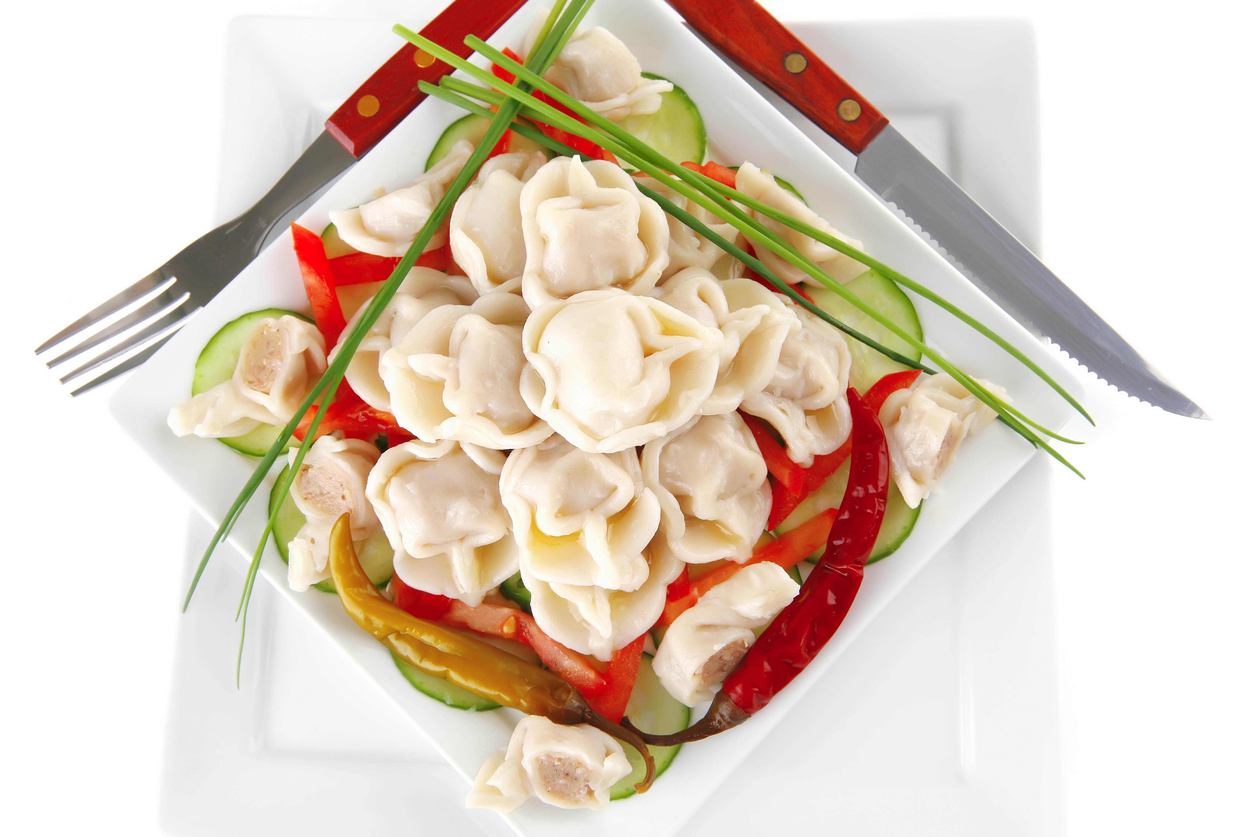 Обои: Белая тарелка с пельменями, красным перцем и огурцами