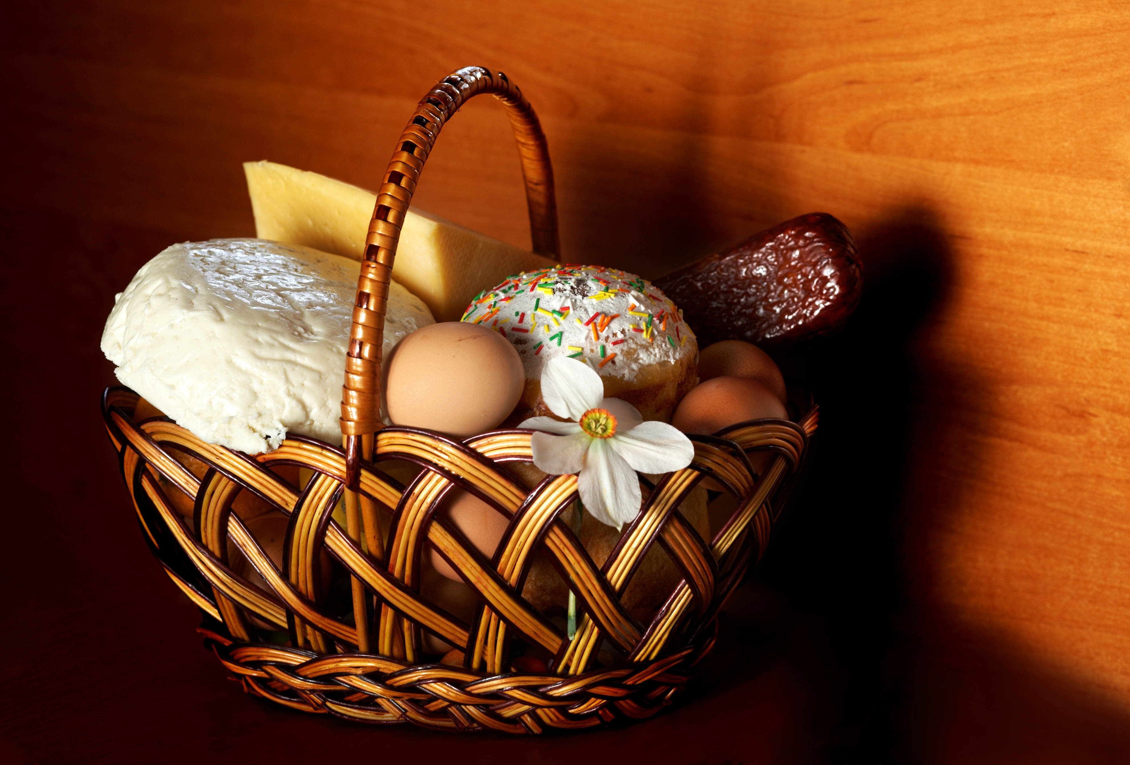 Корзина с пасхальными угощениями у стены - 3964x2684