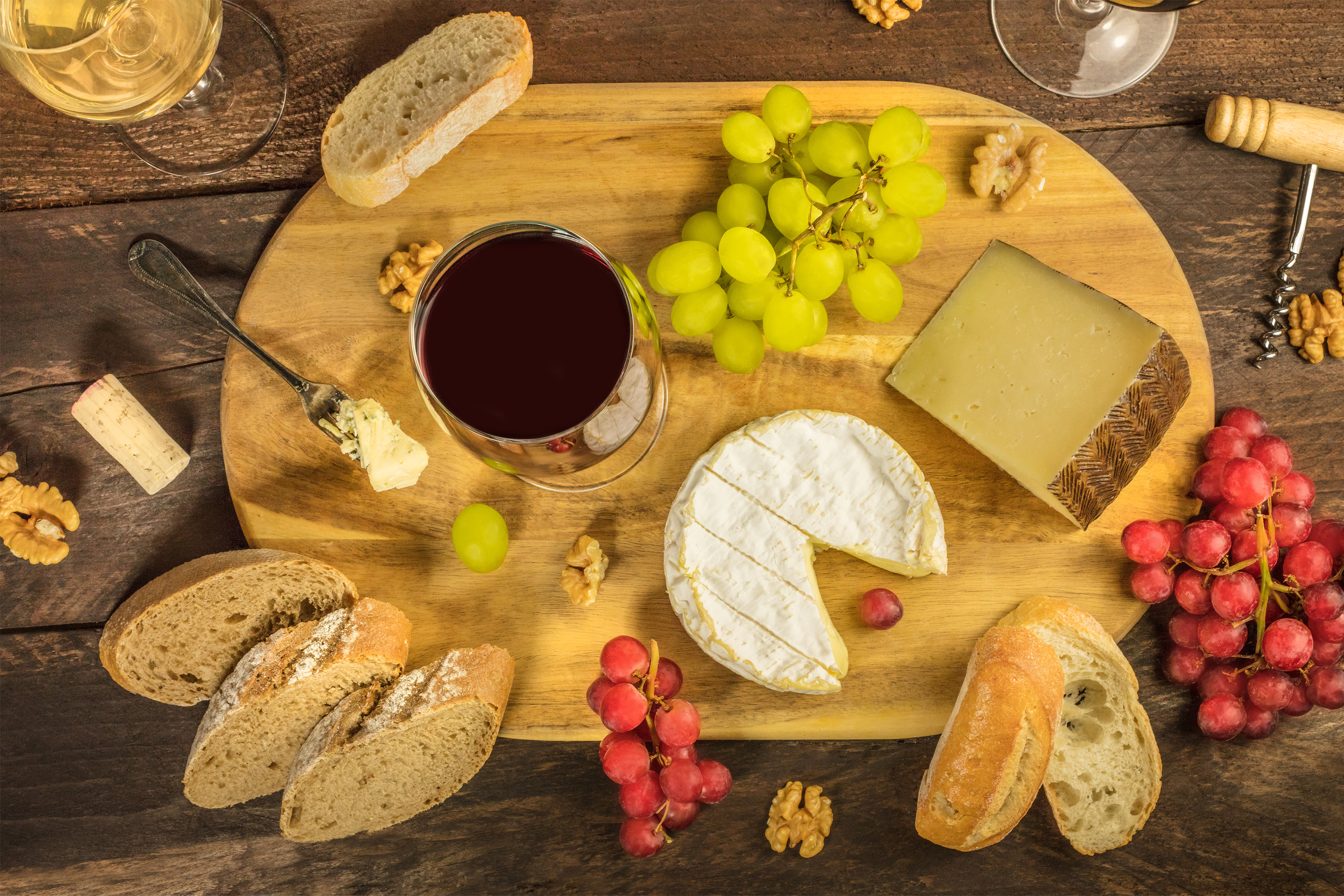 Вино, сыр, виноград и багет на столе - 3960x2640