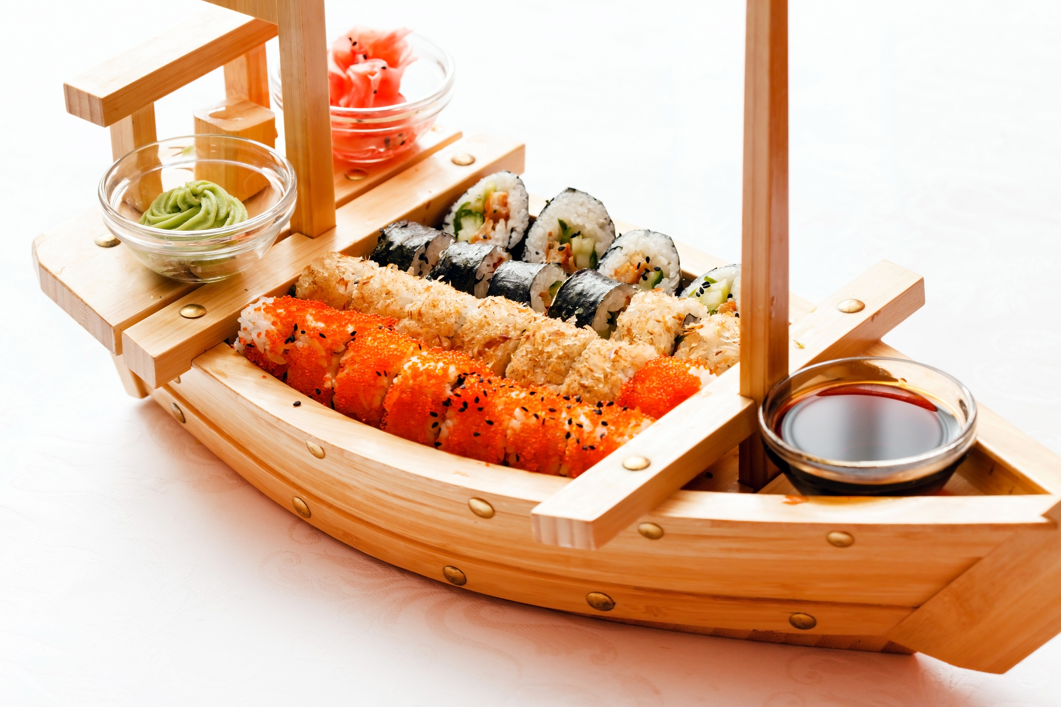 Деревянный корабль с суши, соусом и имбирем - 4500x3000