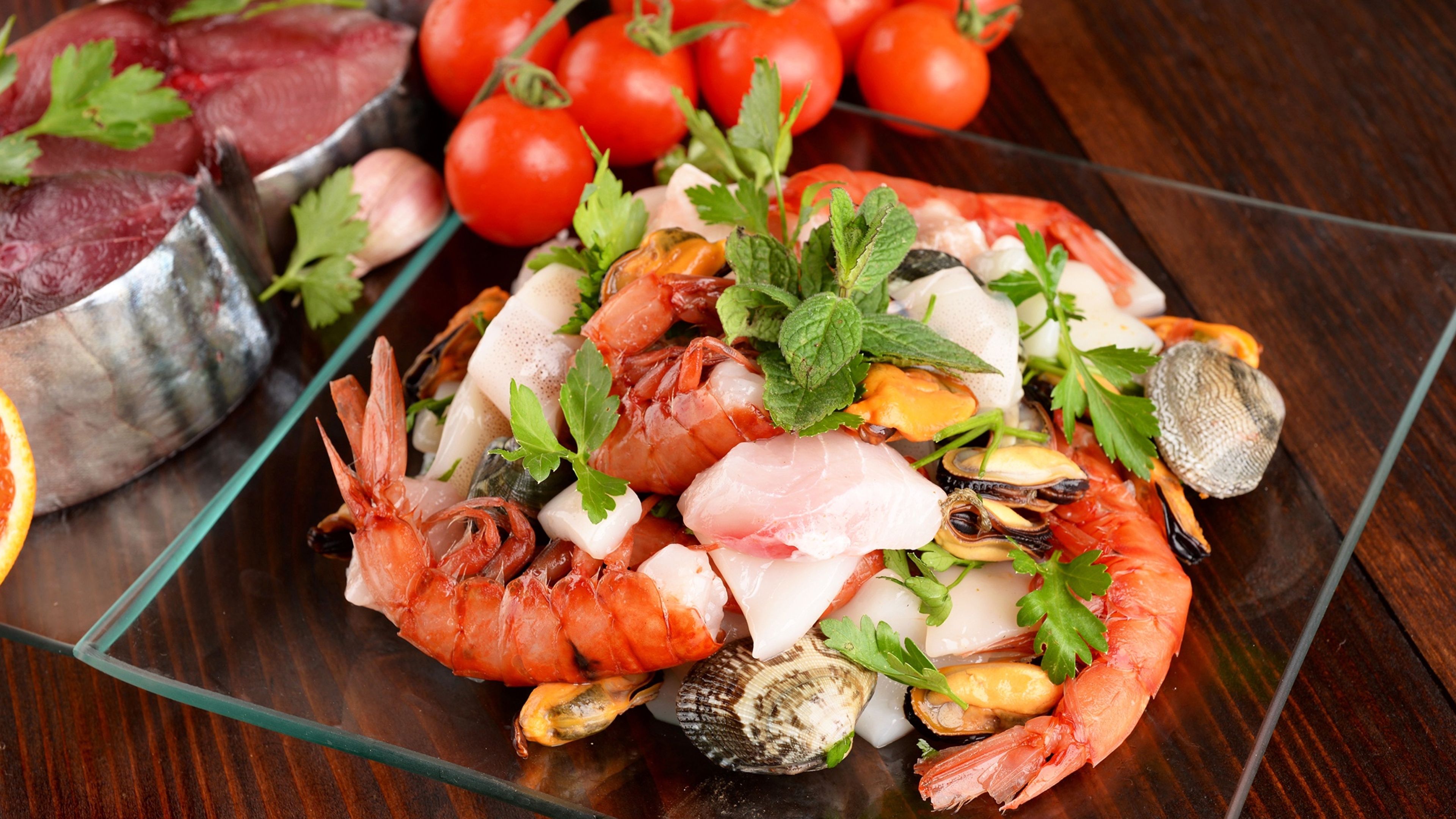 Салат из морепродуктов на стеклянной тарелке - 3840x2160