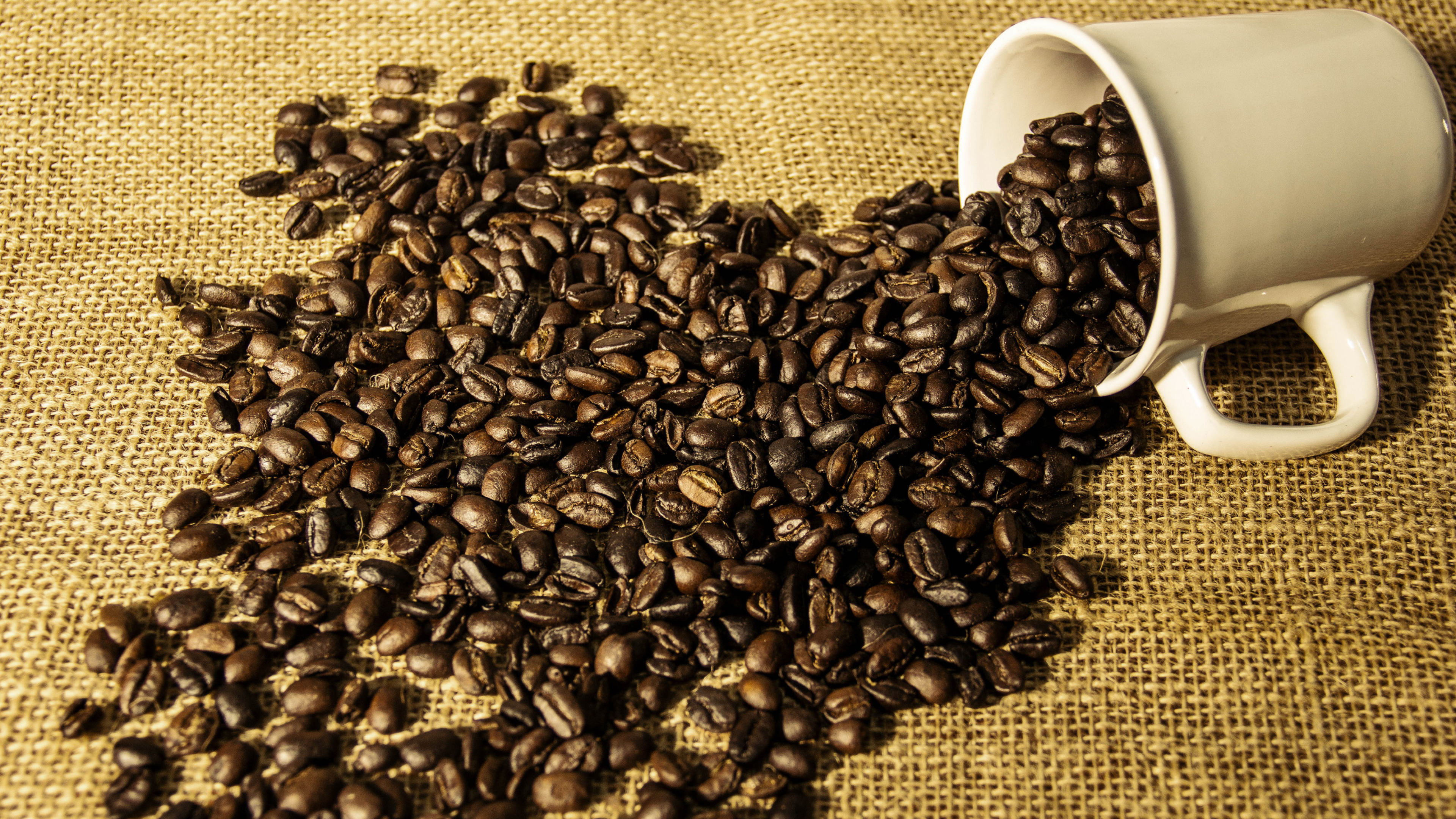 Кофейные зерна высыпаются из белой чашки - 3840x2160