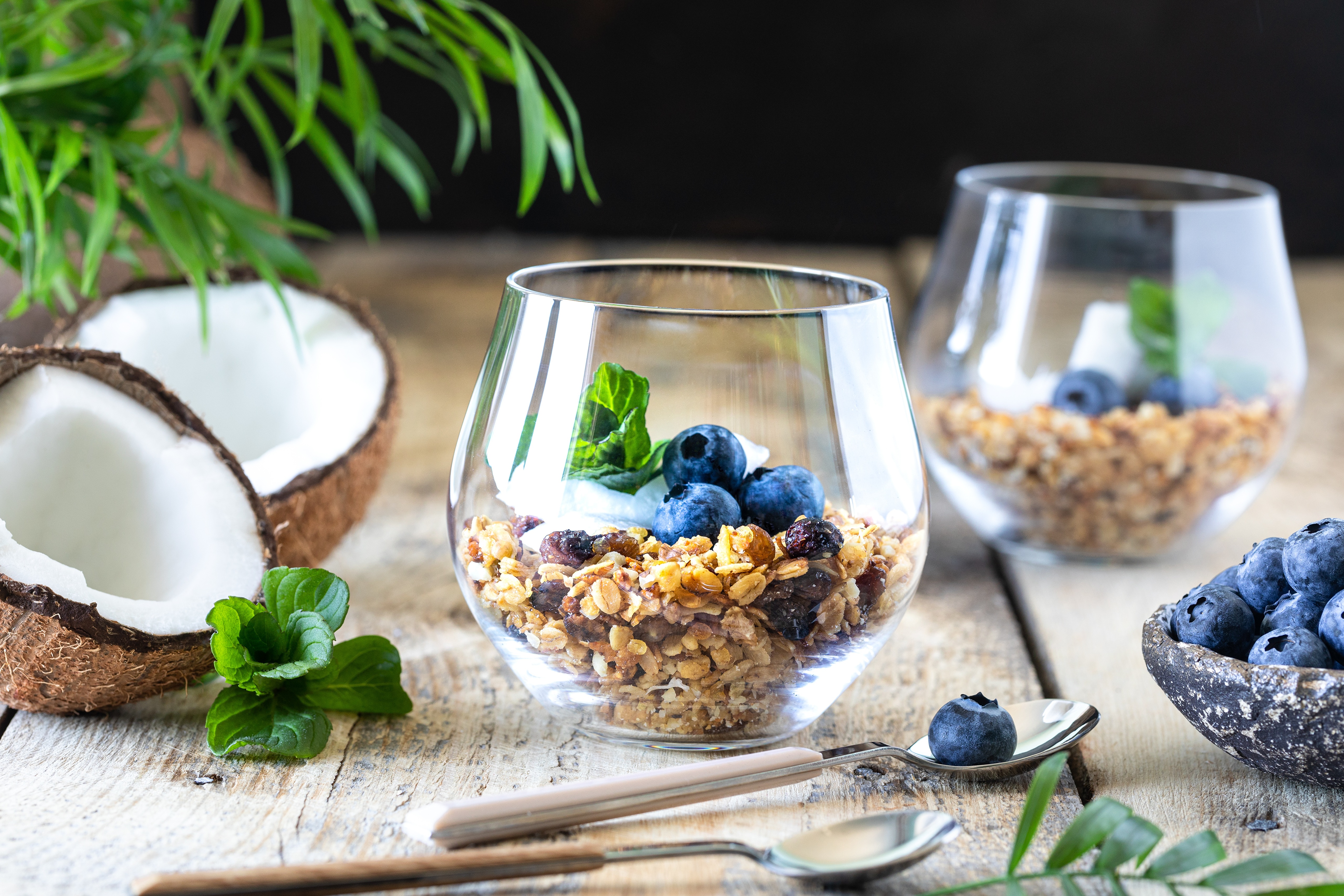 Мюсли с ягодами черники на столе с кокосом - 5120x3413