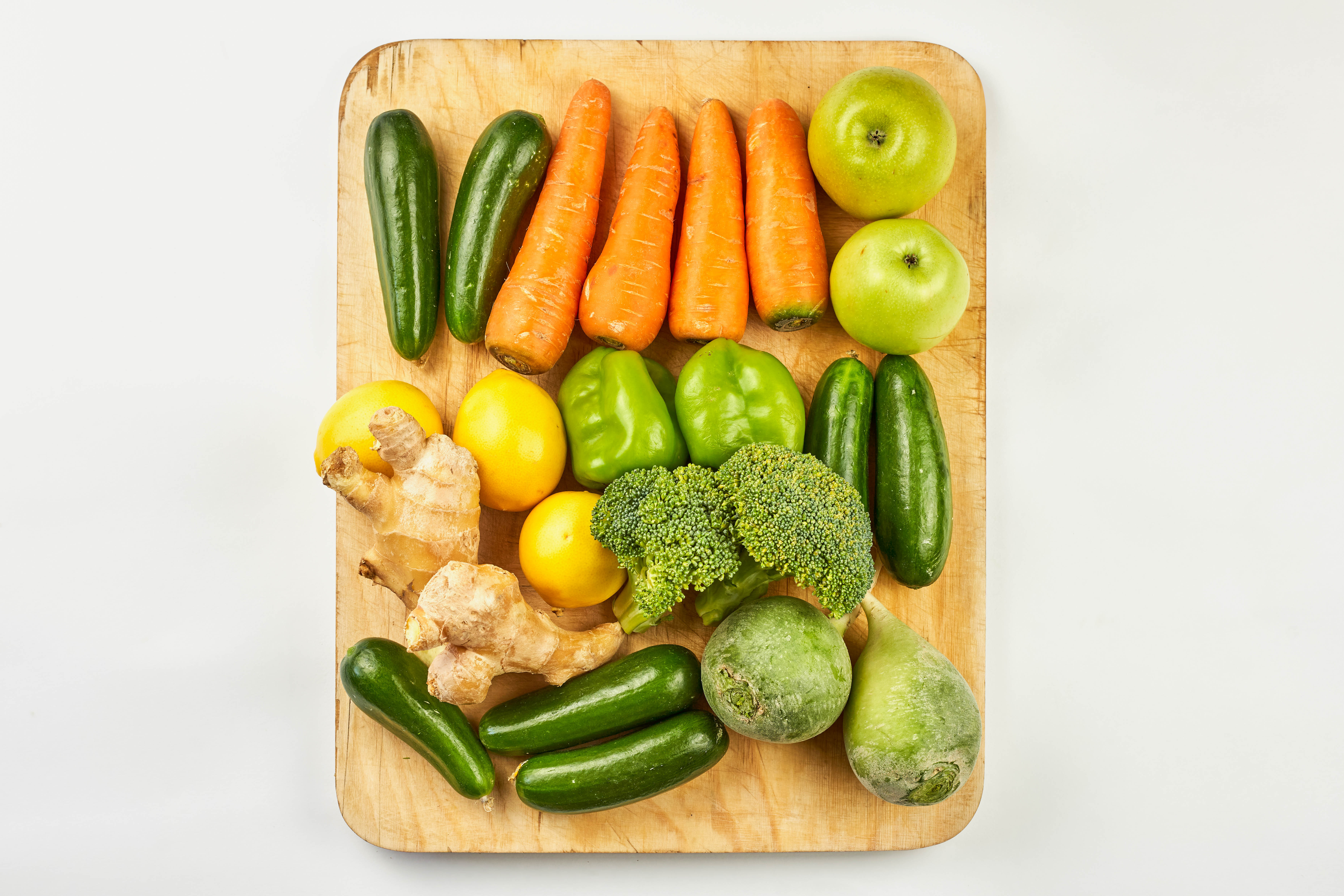 Свежие овощи и фрукты на разделочной доске - 7036x4694