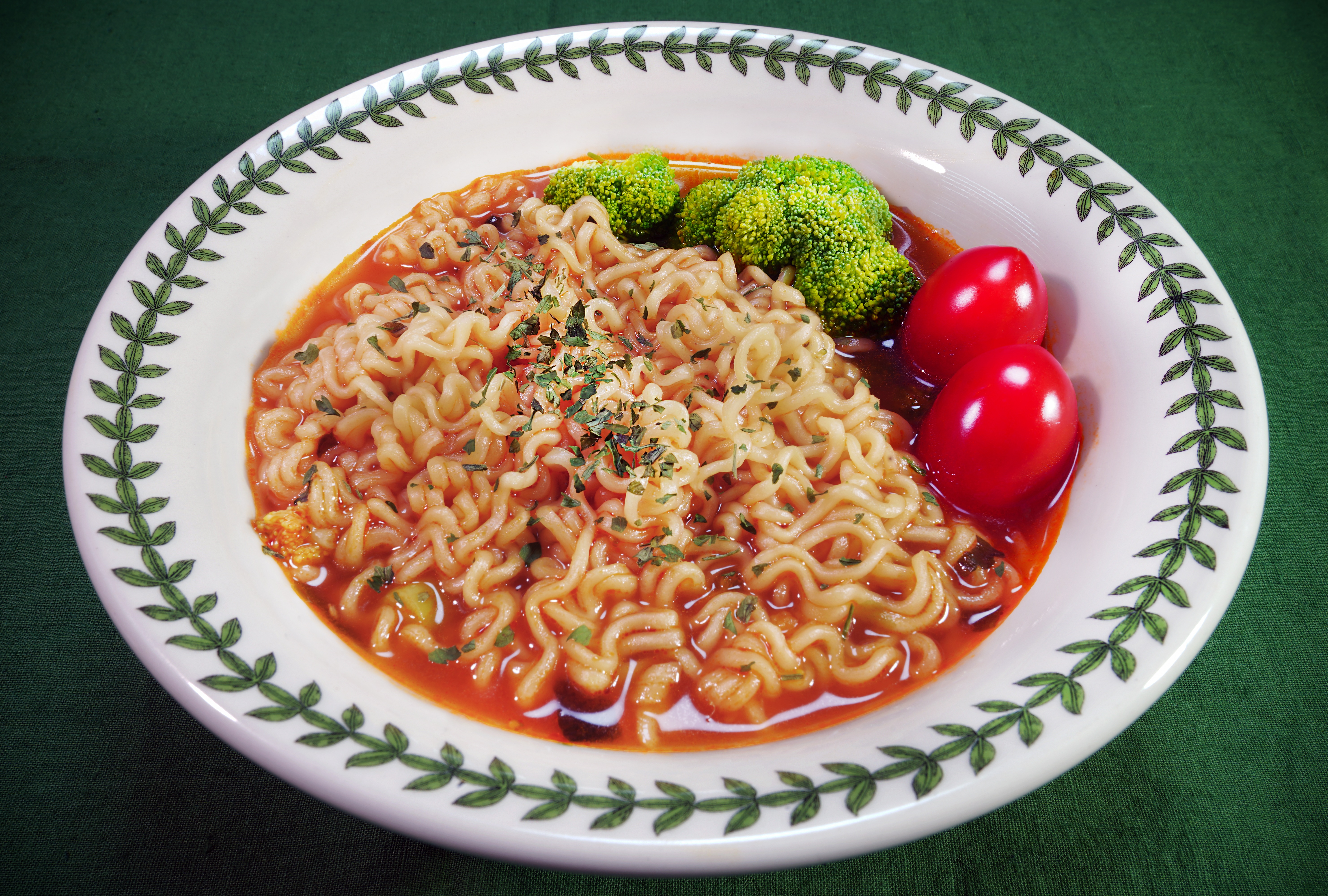 Вермишель с соусом в тарелке с помидорами - 5928x4000