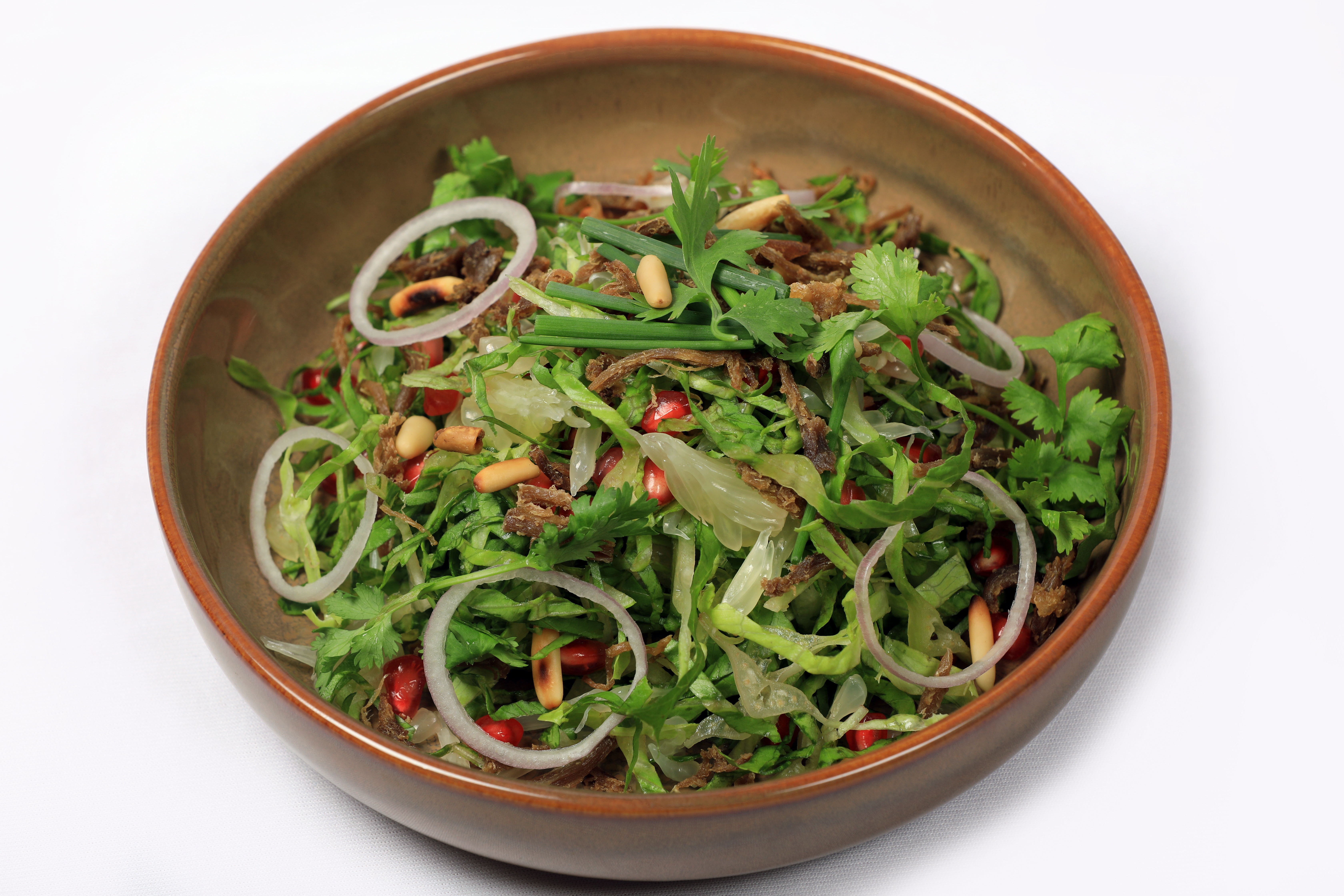 Салат из зелени с мясом на сером фоне - 6720x4480