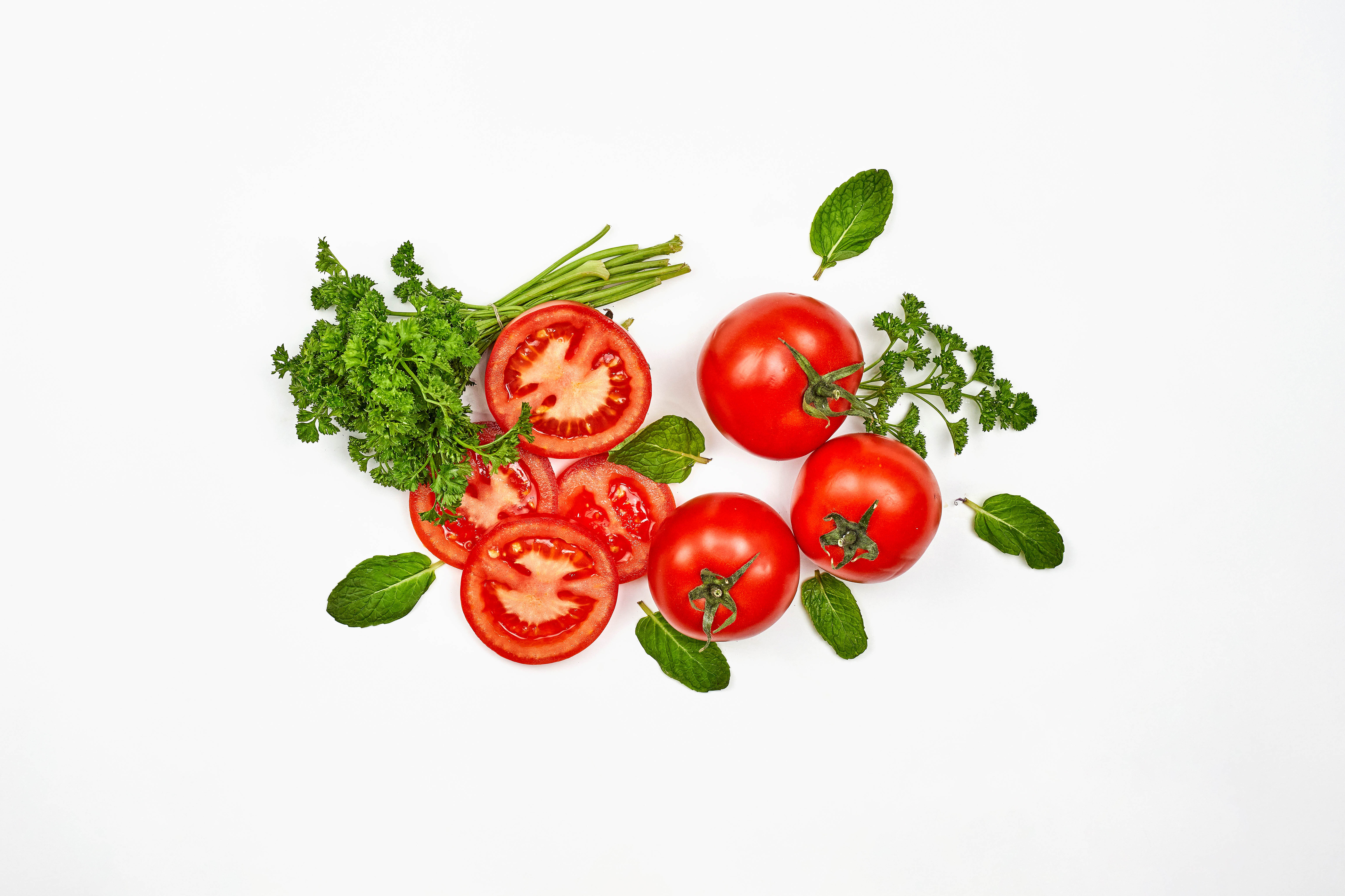 Красные помидоры с петрушкой на белом фоне - 4200x2800