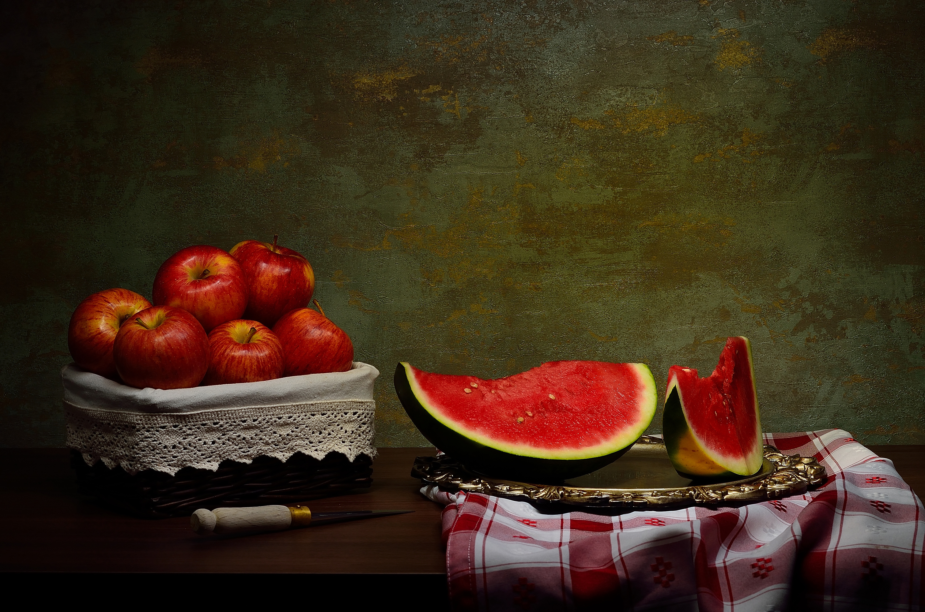 Обои: Скибки арбуза на столе с яблоками