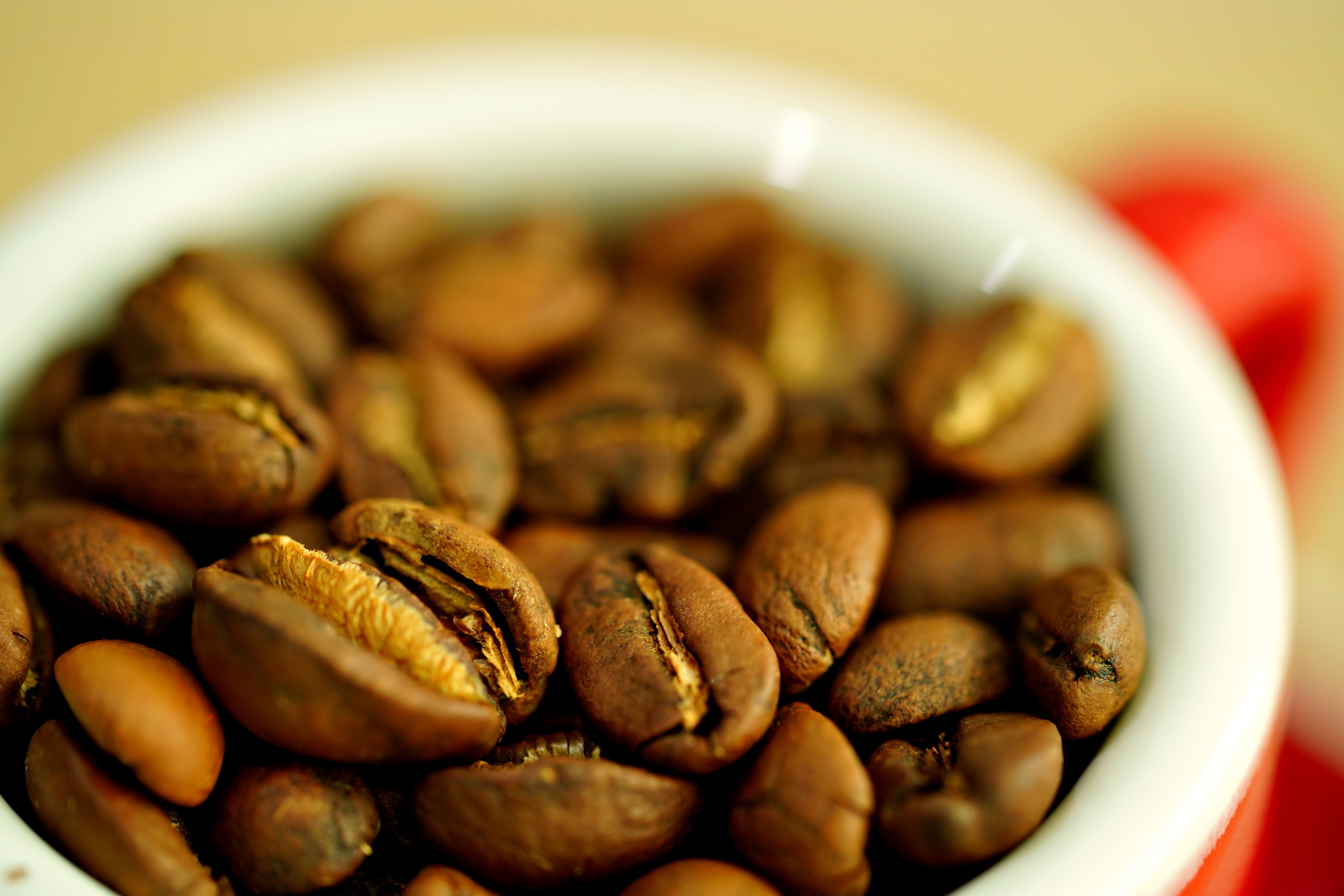Зерна кофе с белой кружке вблизи - 7952x5304