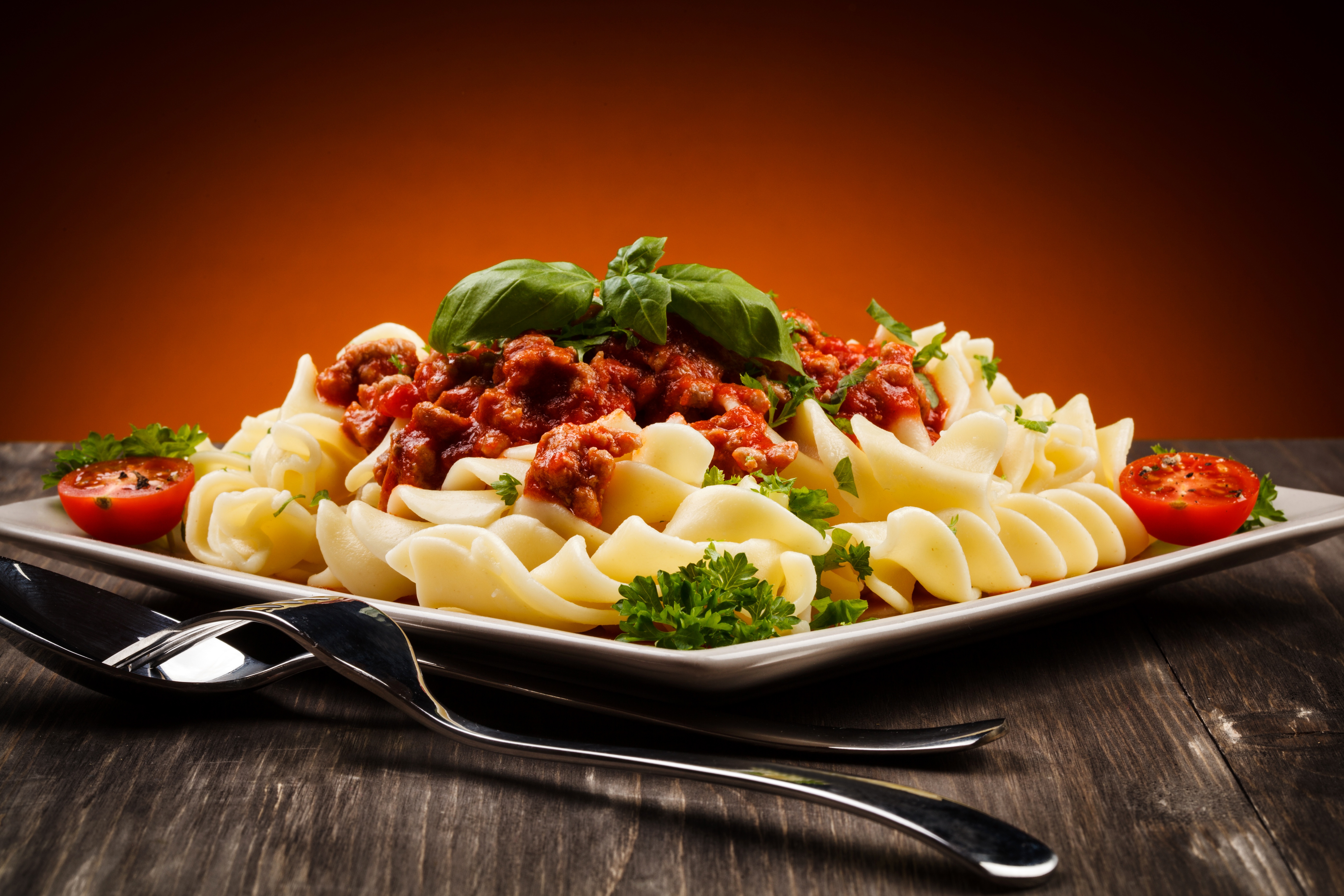 Тарелка с макаронами, фаршем и помидорами - 5616x3744