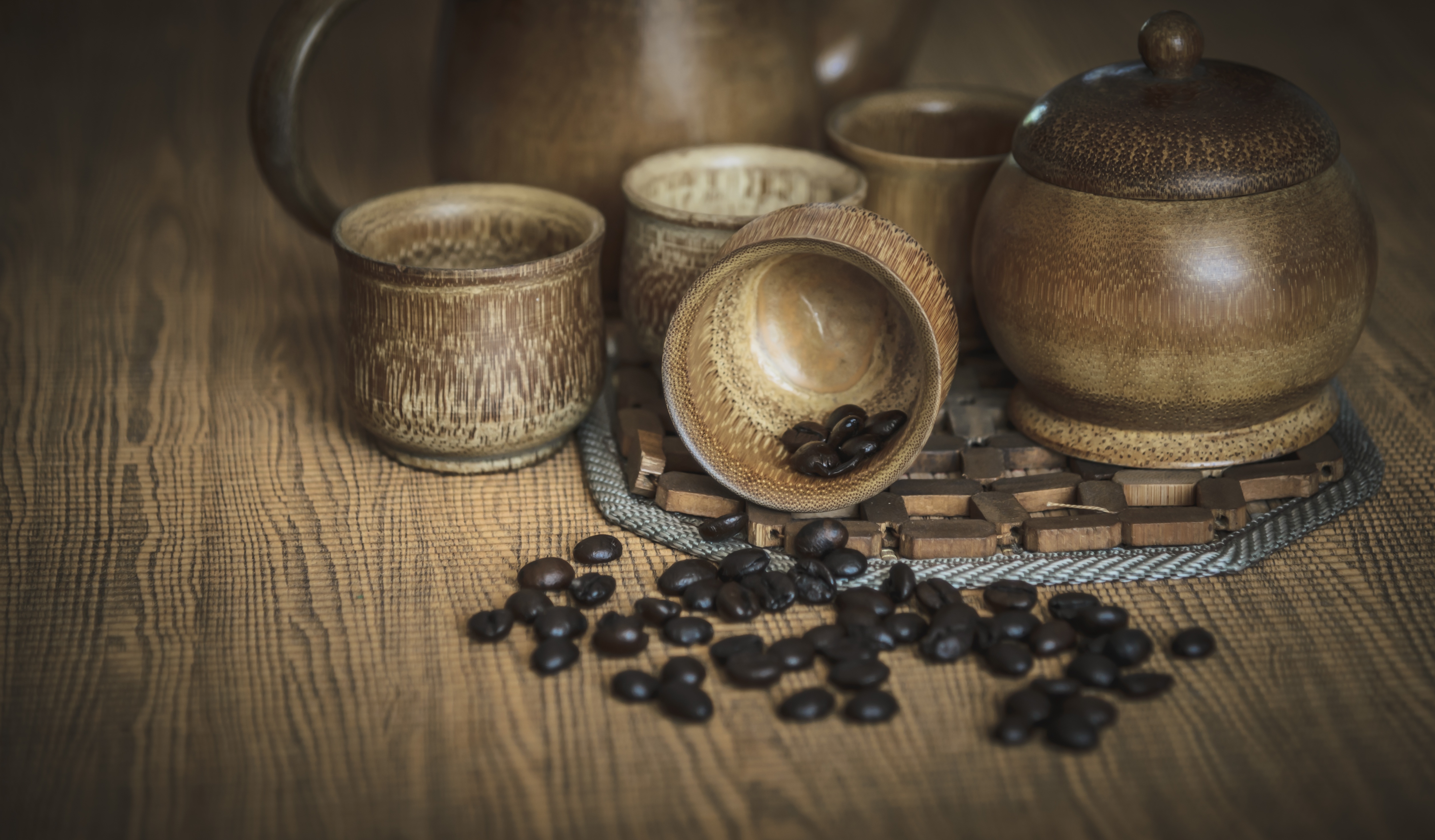 Кофейные зерна с посудой на столе - 5022x2943