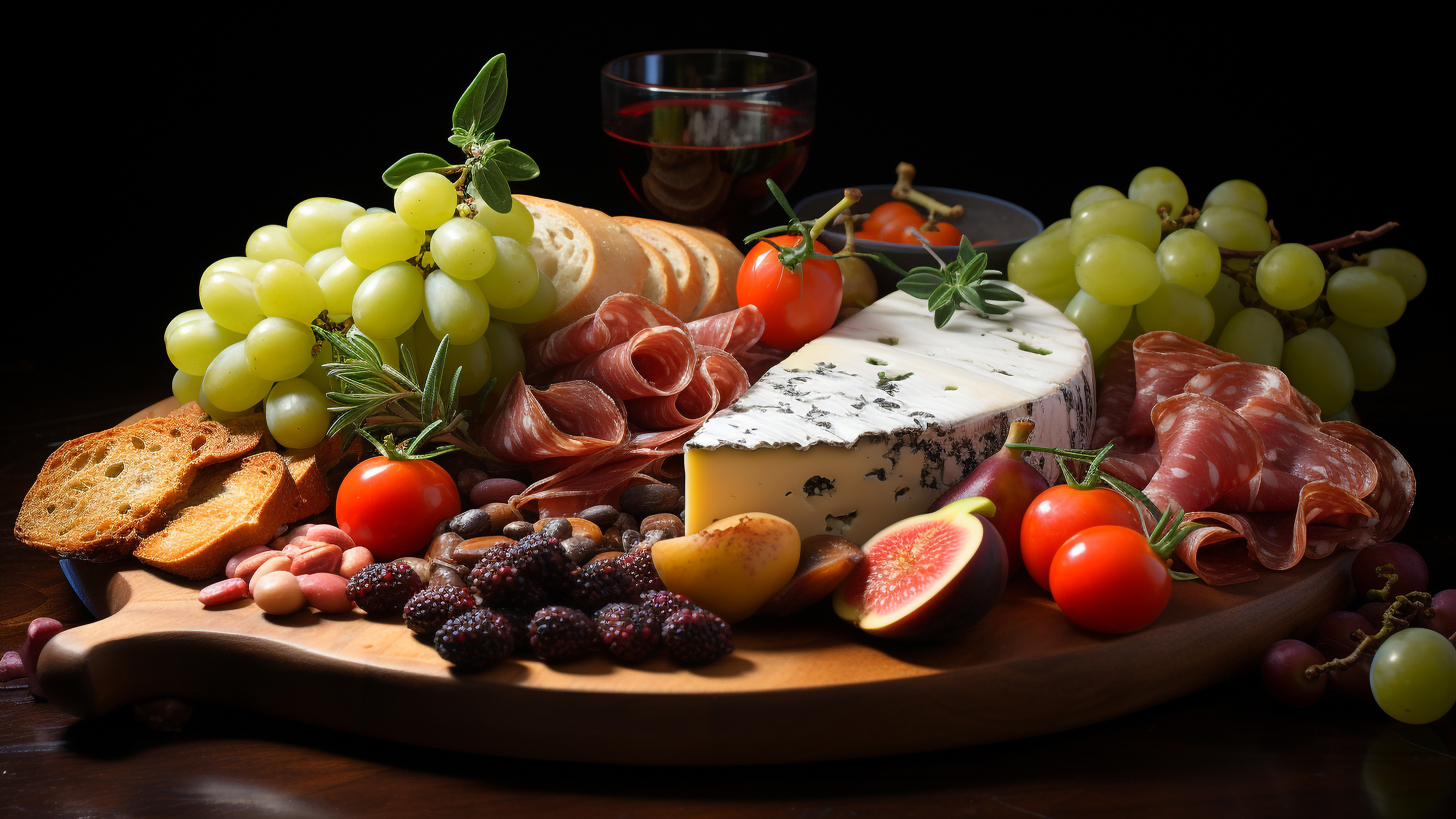 Вкусный сыр с колбасой и виноградом - 3840x2160