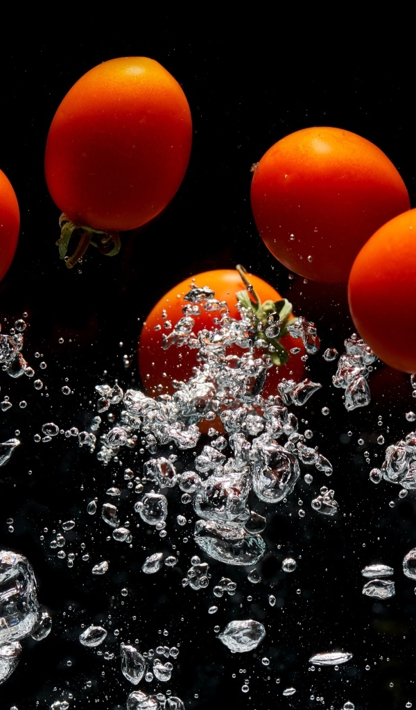 Красные помидоры в воде на черном фоне Обои для рабочего стола 600x1024