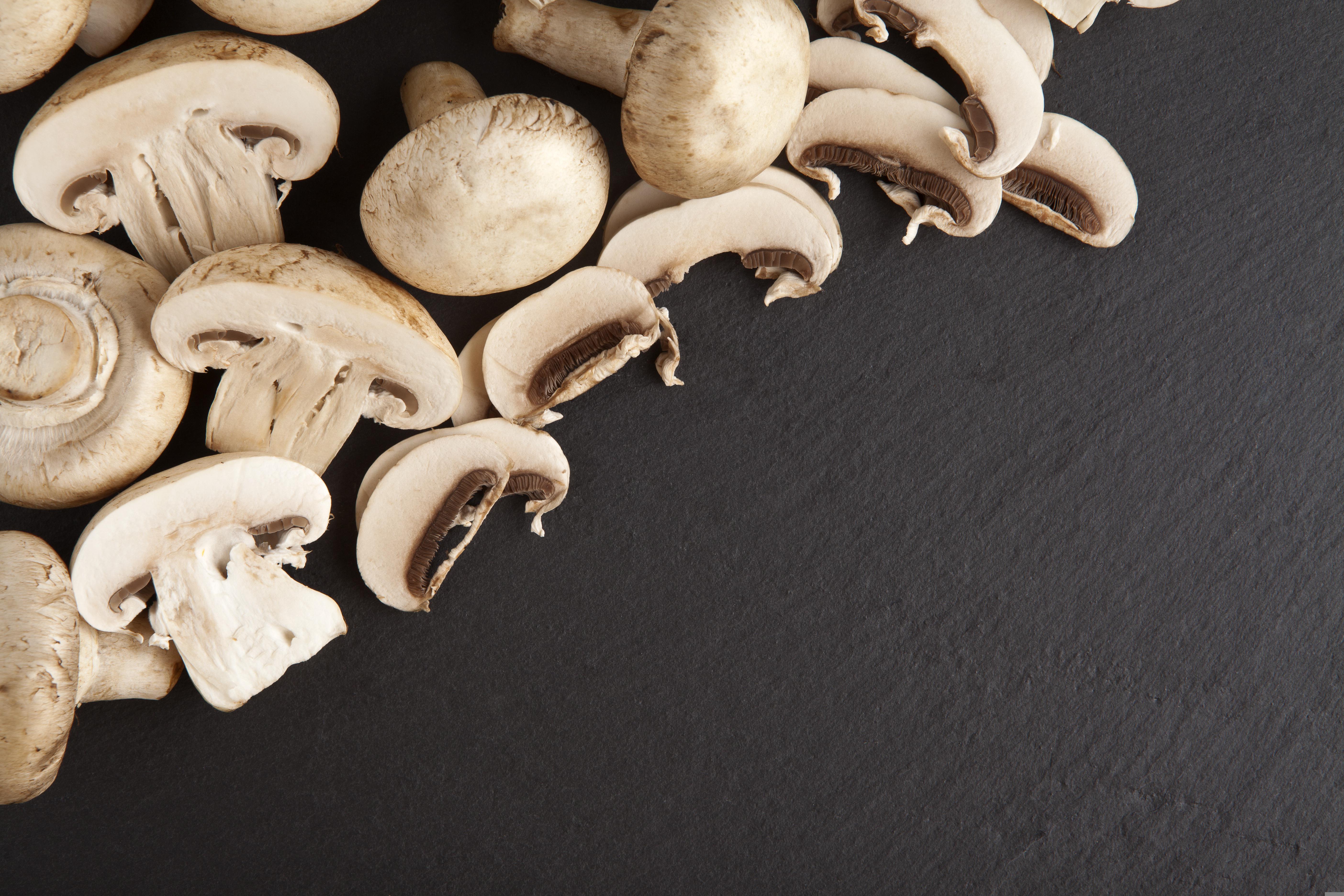 Нарезанные шампиньоны на сером столе - 5616x3744