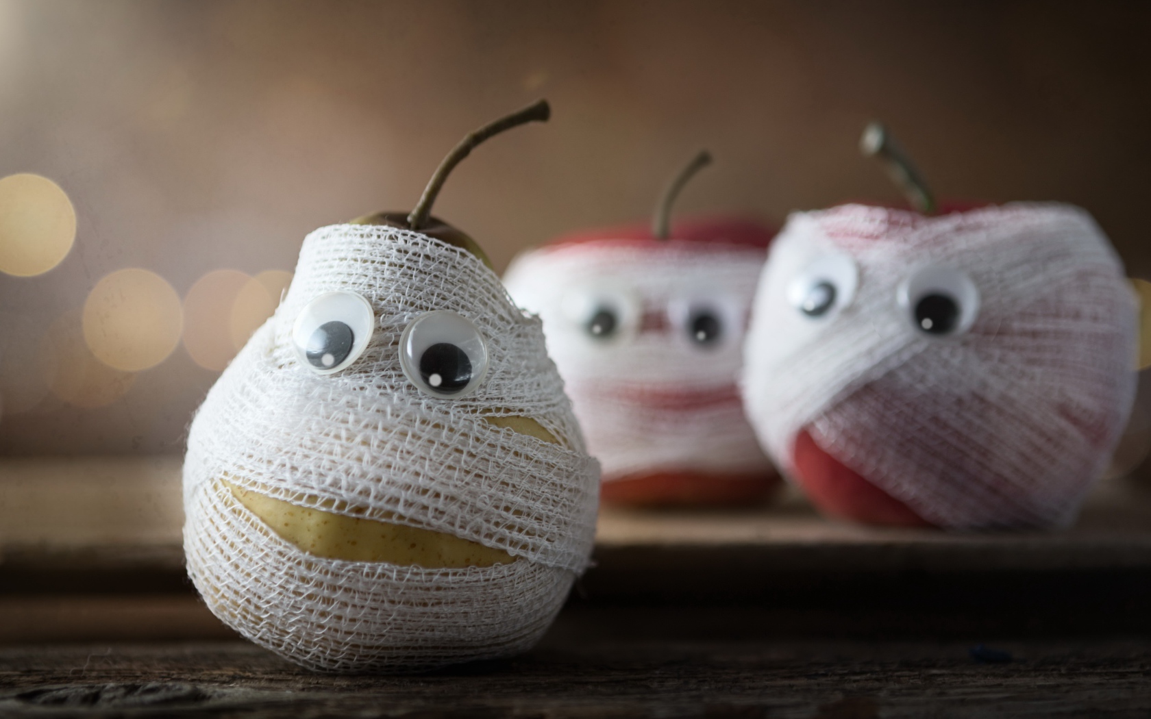 Груши и яблоки в бинтах на столе Обои для рабочего стола 1680x1050