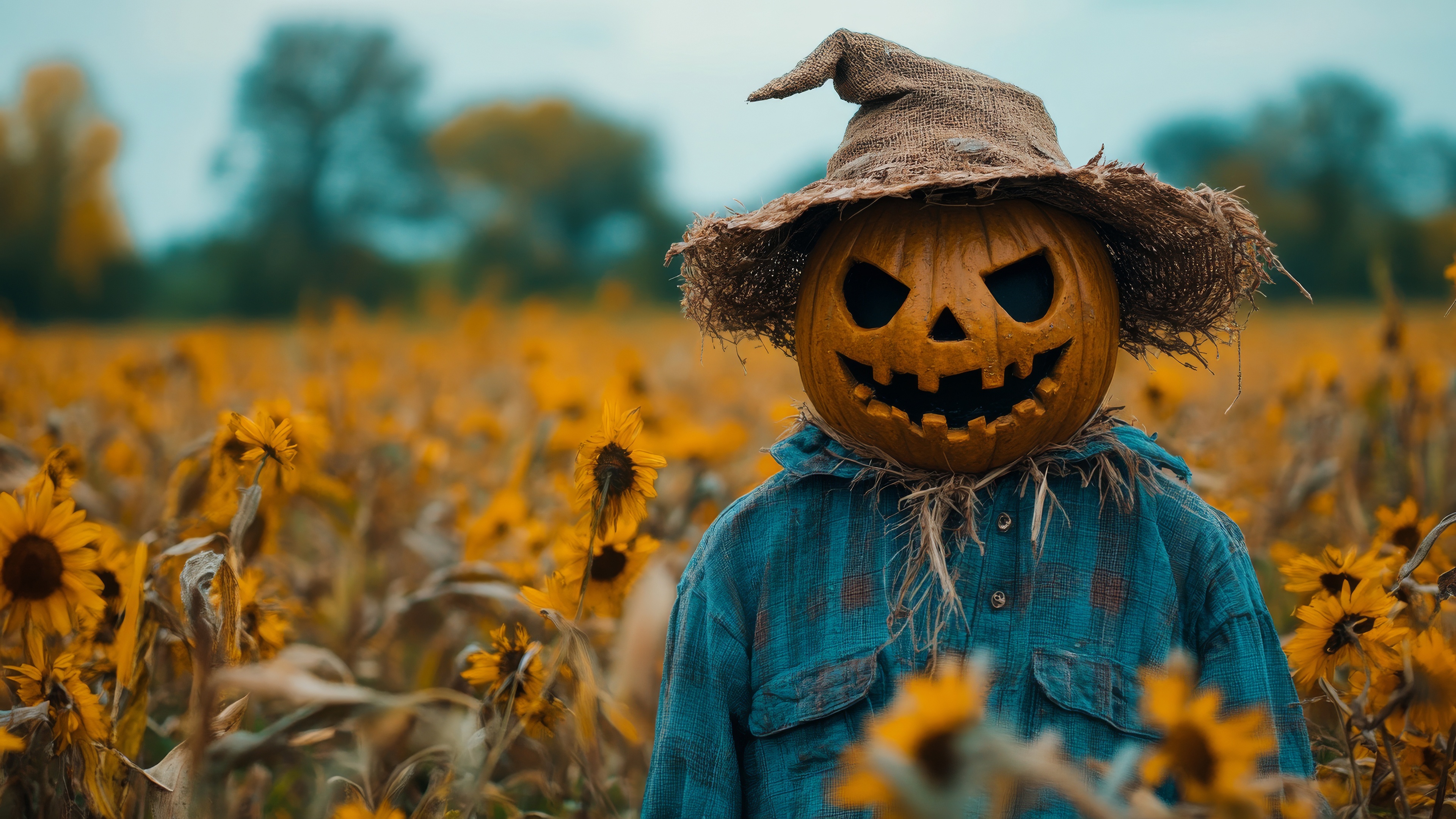 Пугало из тыквы в рубашке на поле - 3840x2160
