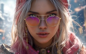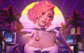 Девушка 3д с розовыми волосами с наушниками в ушах