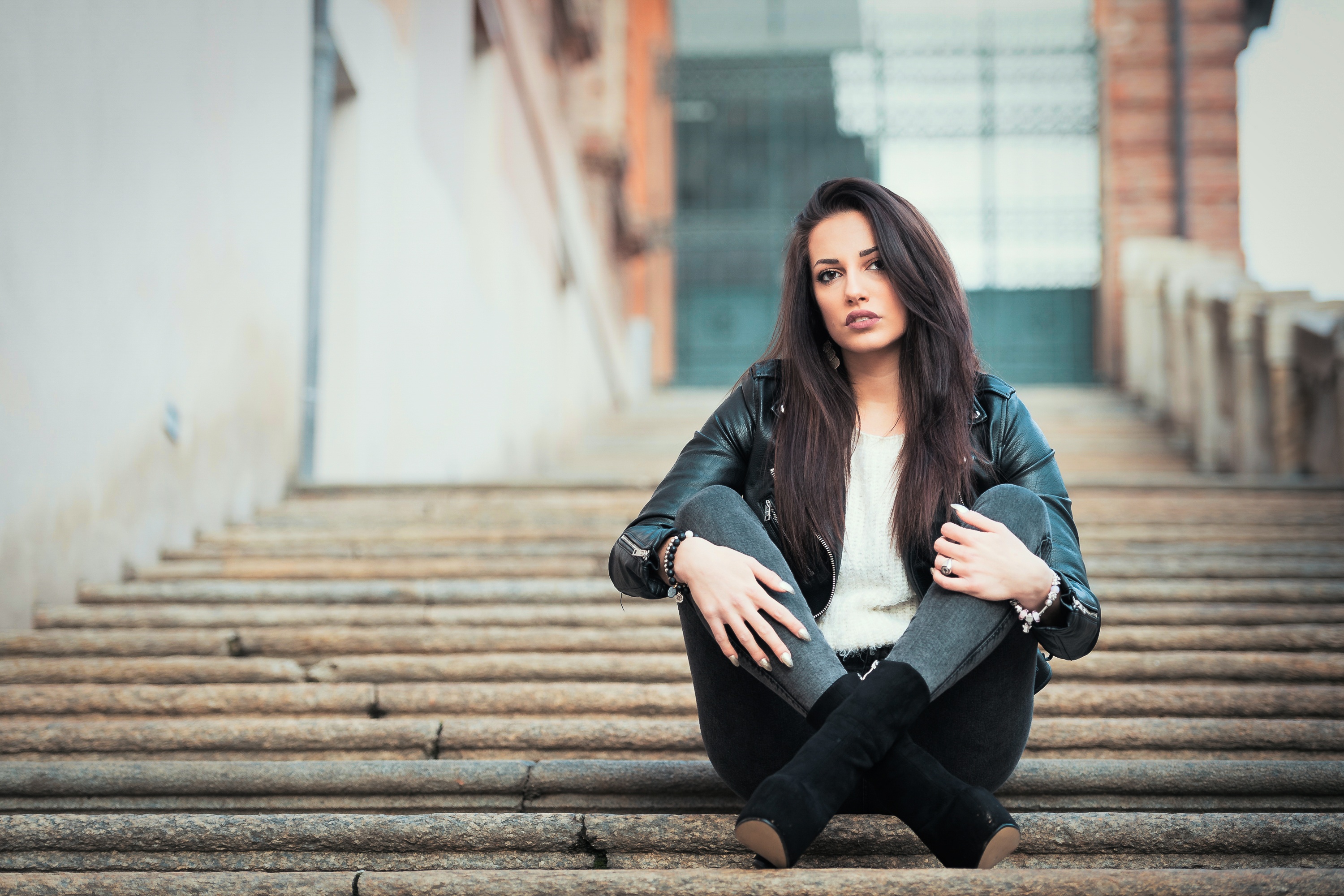 Молодая брюнетка сидит на ступеньках - 3000x2000