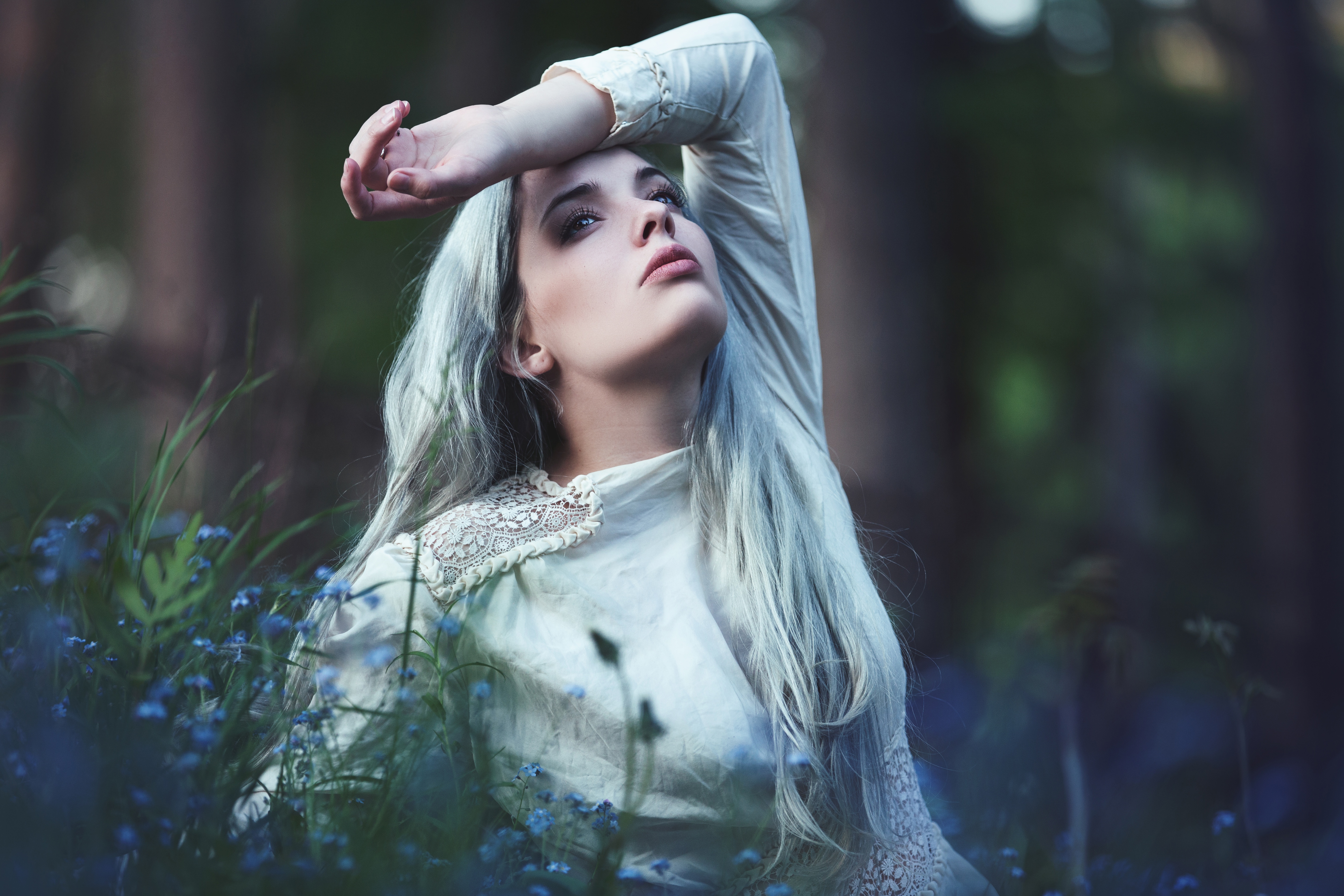 Обои: Грустная молодая блондинка в голубых цветах