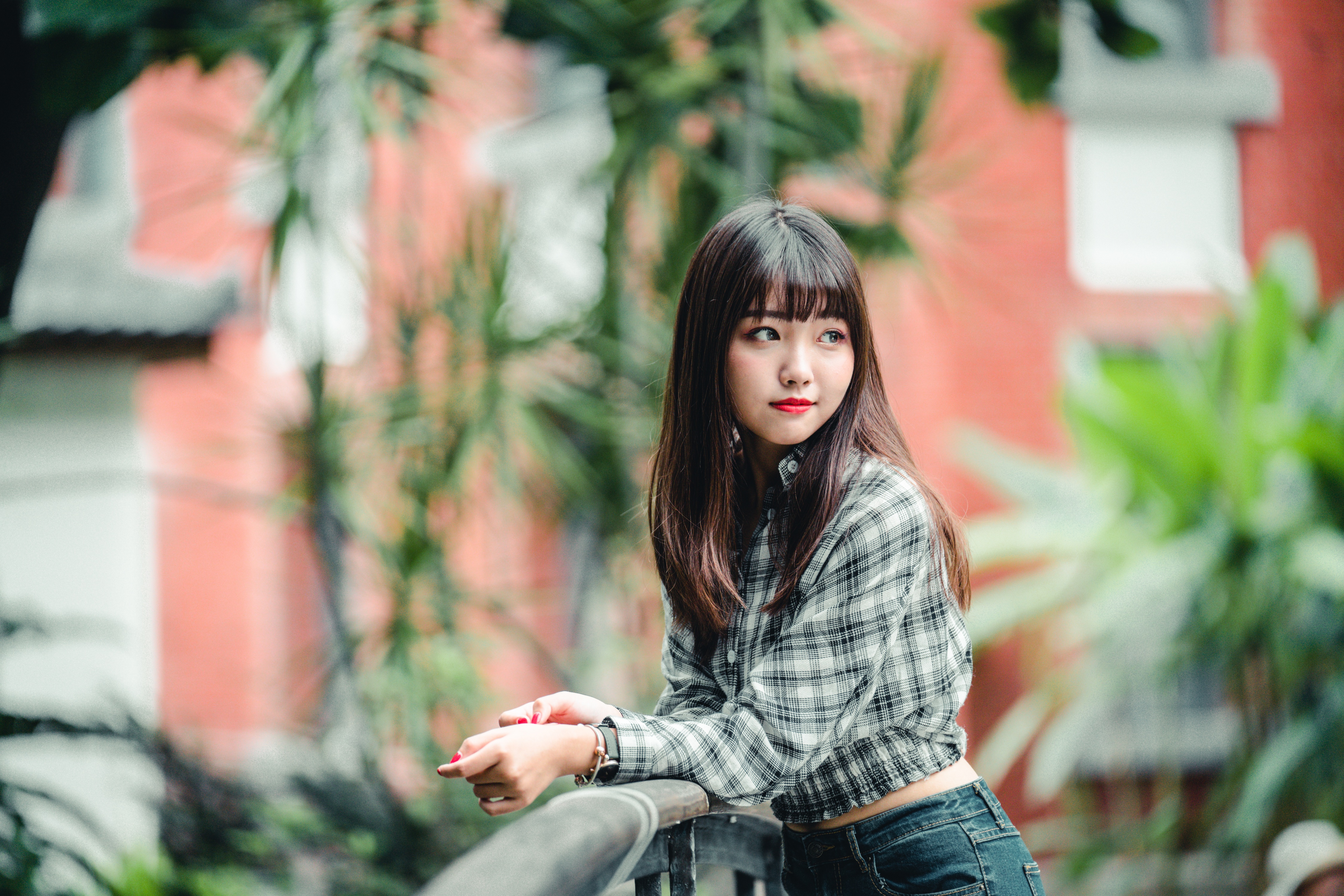 Красивая девушка азиатка в красном кимоно с палочкой в руке