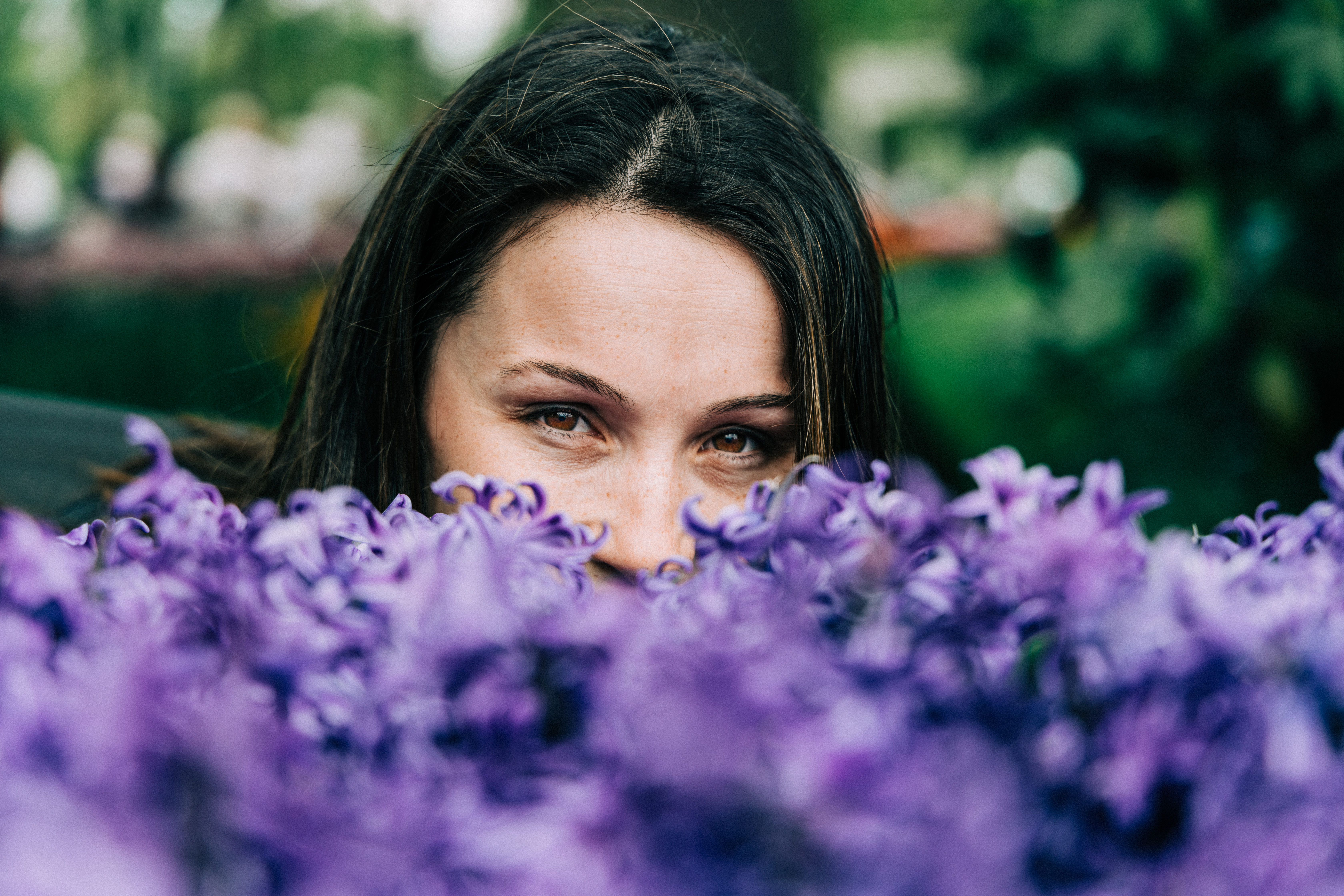 Красивая кареглазая брюнетка с цветами гиацинта - 6720x4480