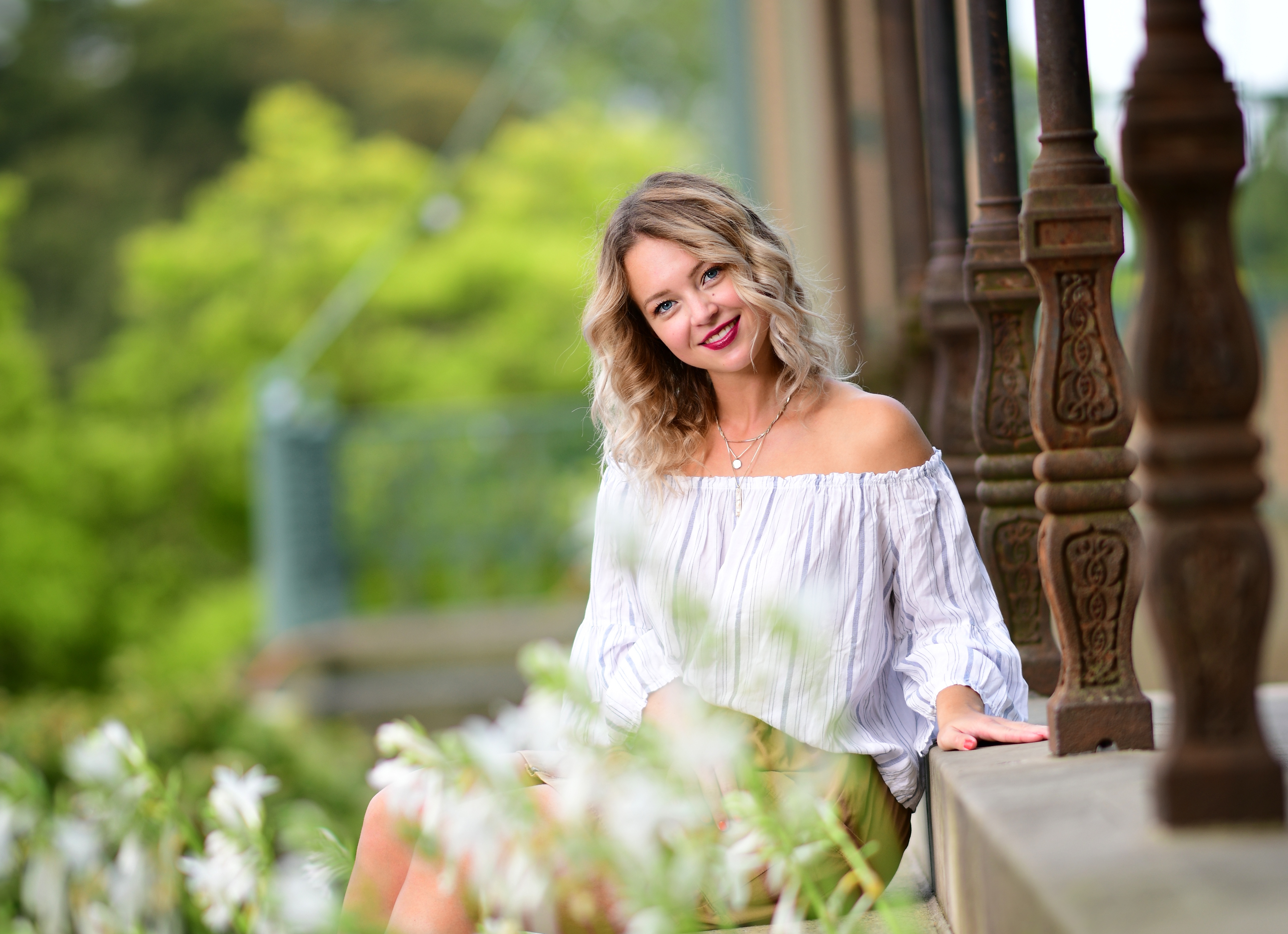Улыбающаяся девушка сидит на ступенях - 4752x3444